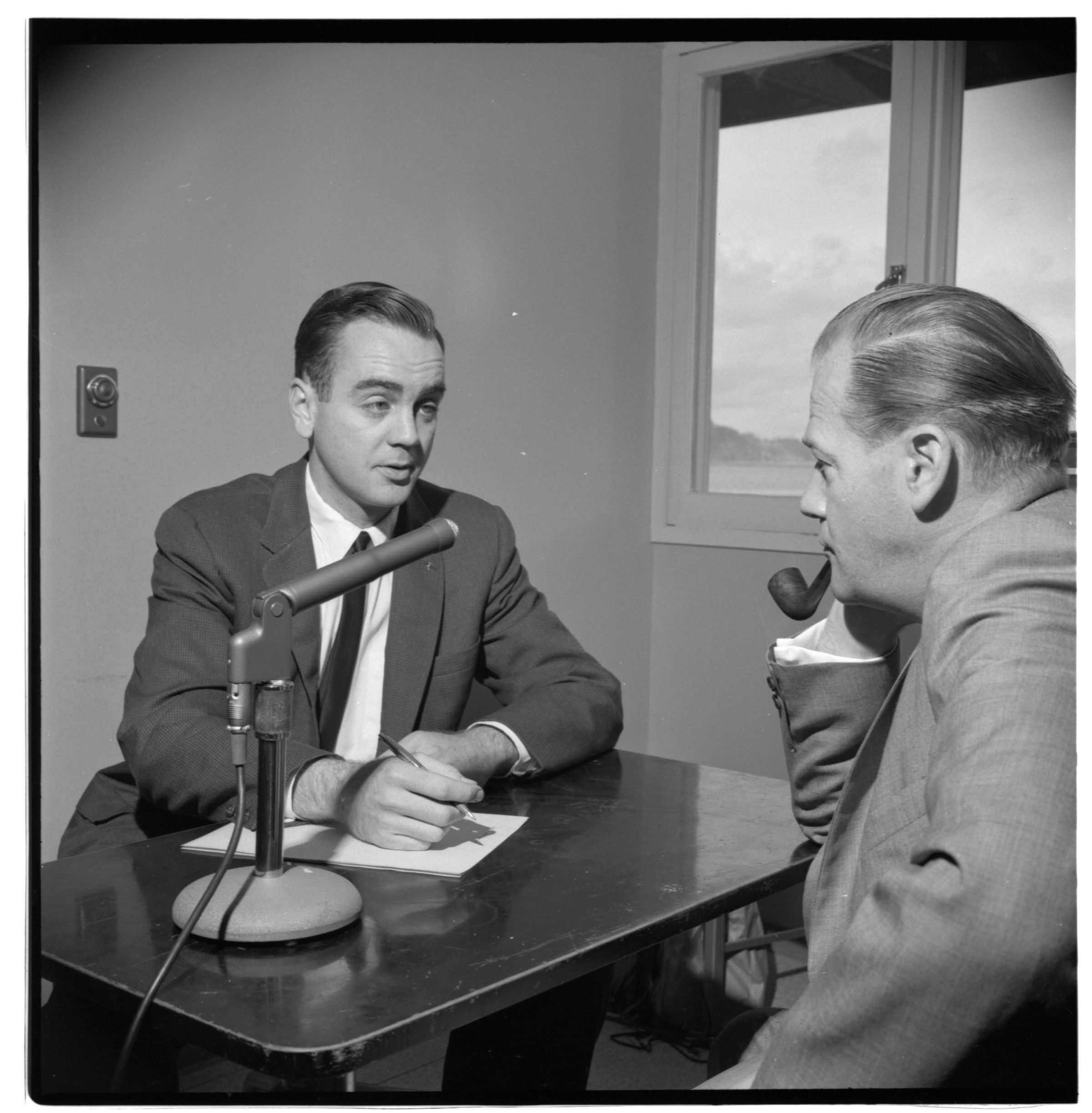 Negative, sheet film. 2 x 2 b&w. No. 884. OB Corp TV. Hank Weaver, radio sports personality from California, visits Olympia brewery and KGY. Article in May 1962 "Its the Water News." At left is Russ Butler of KGY.Name/Title