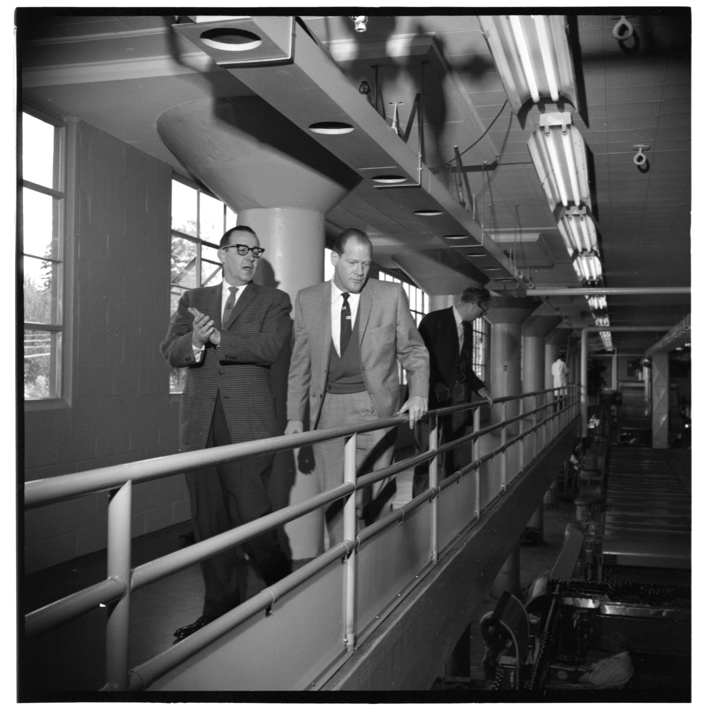 Negative, sheet film. 2 x 2 b&w. No. 884. OB Corp TV. Hank Weaver, radio sports personality from California, visits Olympia brewery and KGY. Article in May 1962 "Its the Water News." Bobby Schmidt at left. No ID on man on right.Name/Title