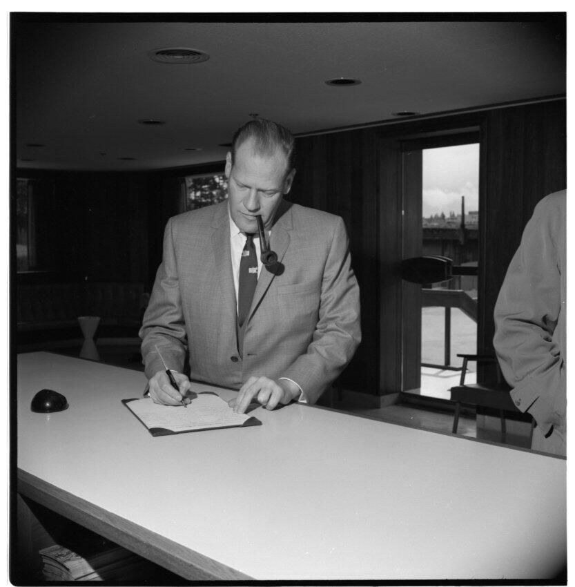Negative, sheet film. 2 x 2 b&w. No. 884. OB Corp TV. Hank Weaver, radio sports personality from California, visits Olympia brewery and KGY. Article in May 1962 "Its the Water News."