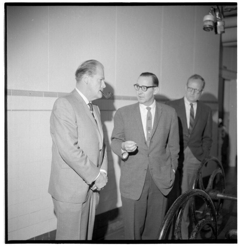 Negative, sheet film. 2 x 2 b&w. No. 884. OB Corp TV. Hank Weaver, radio sports personality from California, visits Olympia brewery and KGY. Article in May 1962 "Its the Water News." Bobby Schmidt in center. No ID on man on right.Name/Title