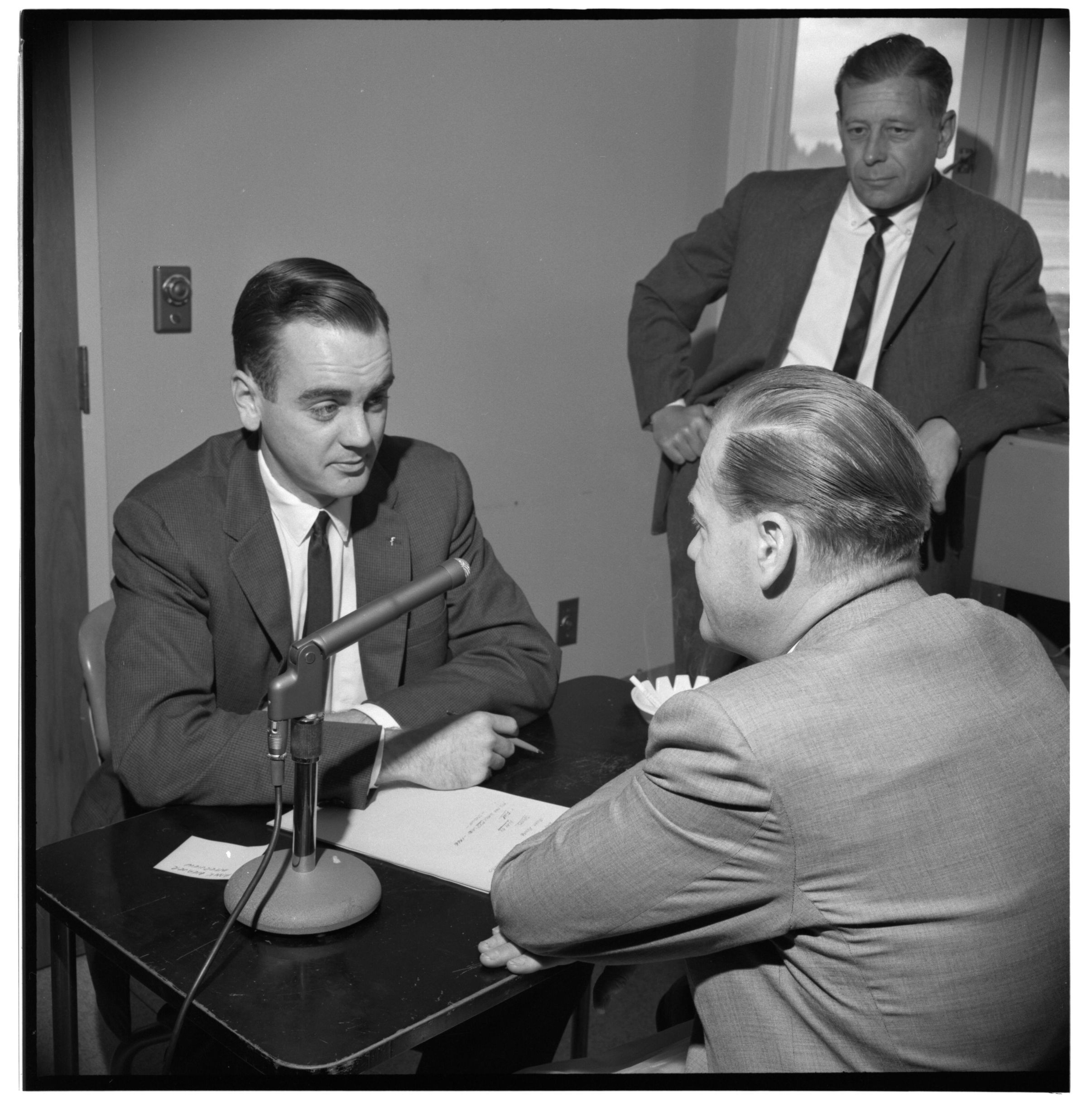 Negative, sheet film. 2 x 2 b&w. No. 884. OB Corp TV. Hank Weaver, radio sports personality from California, visits Olympia brewery and KGY. Article in May 1962 "Its the Water News." On left is Russ Butler of KGY. Standing is Barney Renderer of OBC.Name/Title