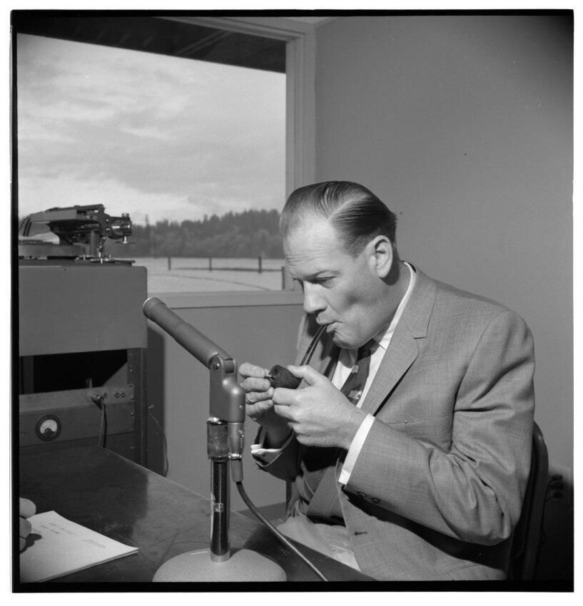 Negative, sheet film. 2 x 2 b&w. No. 884. OB Corp TV. Hank Weaver, radio sports personality from California, visits Olympia brewery and KGY. Article in May 1962 "Its the Water News."