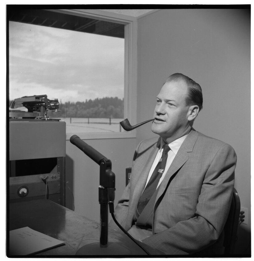 Negative, sheet film. 2 x 2 b&w. No. 884. OB Corp TV. Hank Weaver, radio sports personality from California, visits Olympia brewery and KGY. Article in May 1962 "Its the Water News."