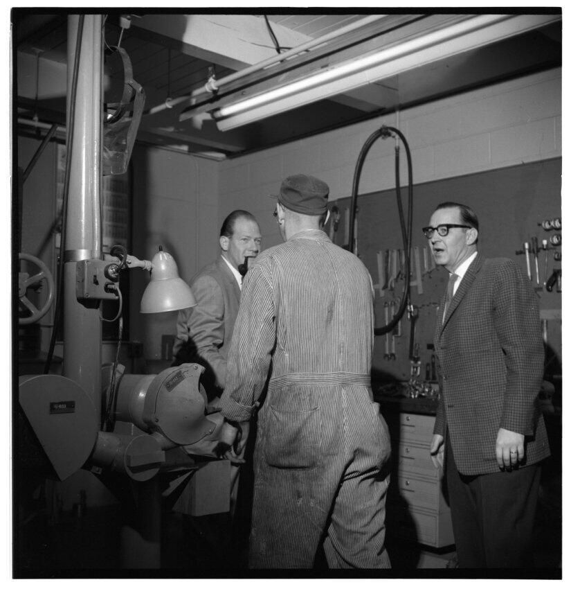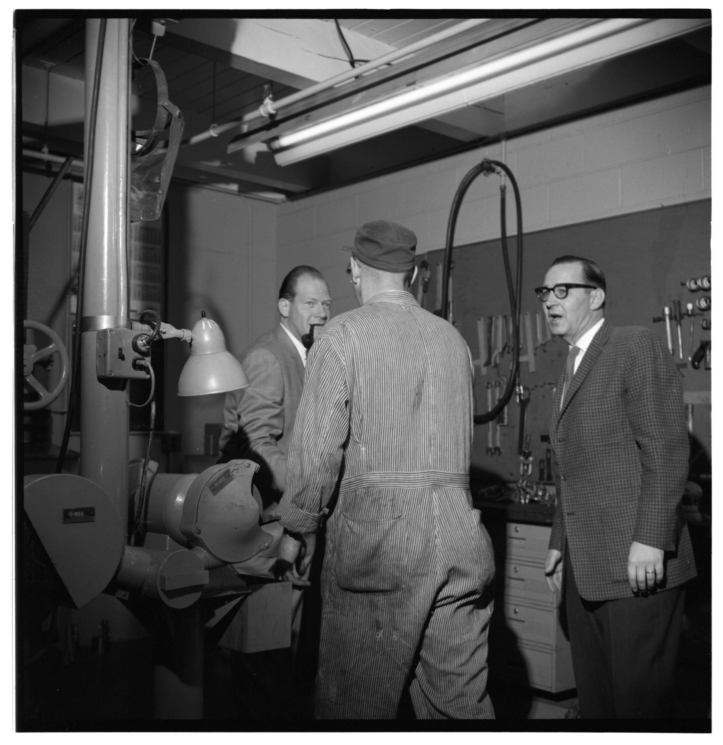 Negative, sheet film. 2 x 2 b&w. No. 884. OB Corp TV. Hank Weaver, radio sports personality from California, visits Olympia brewery and KGY. Article in May 1962 "Its the Water News." Bobby Schmidt on right. No ID on man in center.Name/Title