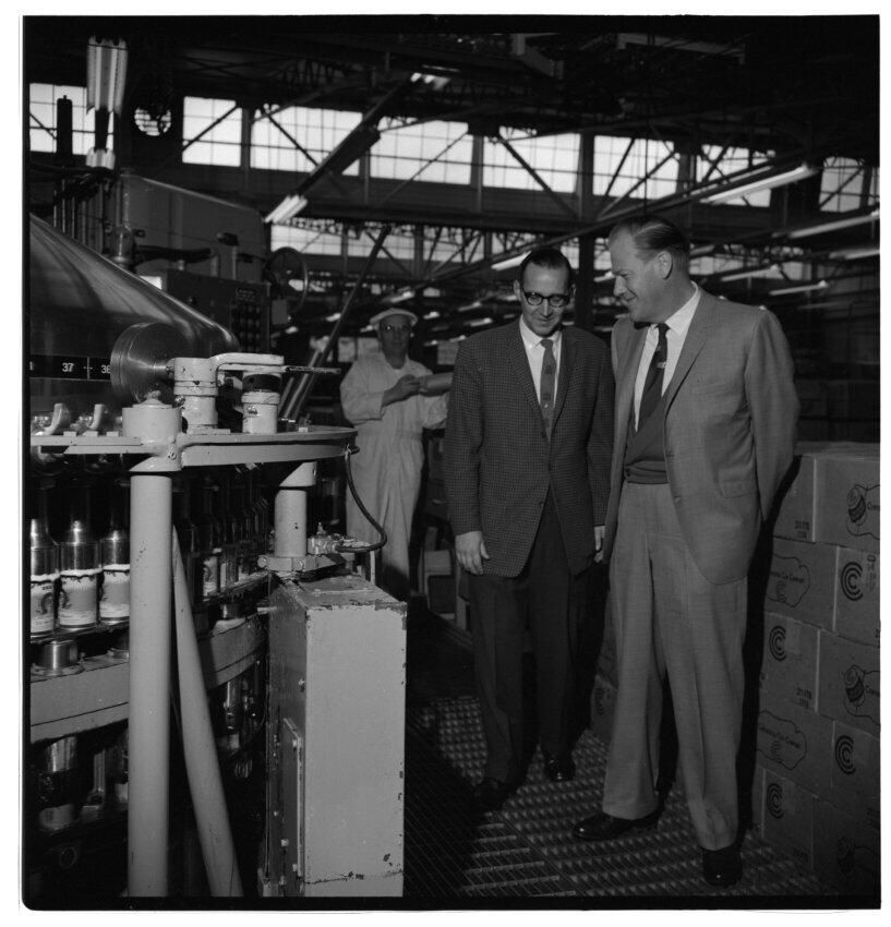 Negative, sheet film. 2 x 2 b&w. No. 884. OB Corp TV. Hank Weaver, radio sports personality from California, visits Olympia brewery and KGY. Article in May 1962 "Its the Water News." Bobby Schmidt in center. At left is Vince Kearin, machine operator.Name/Title