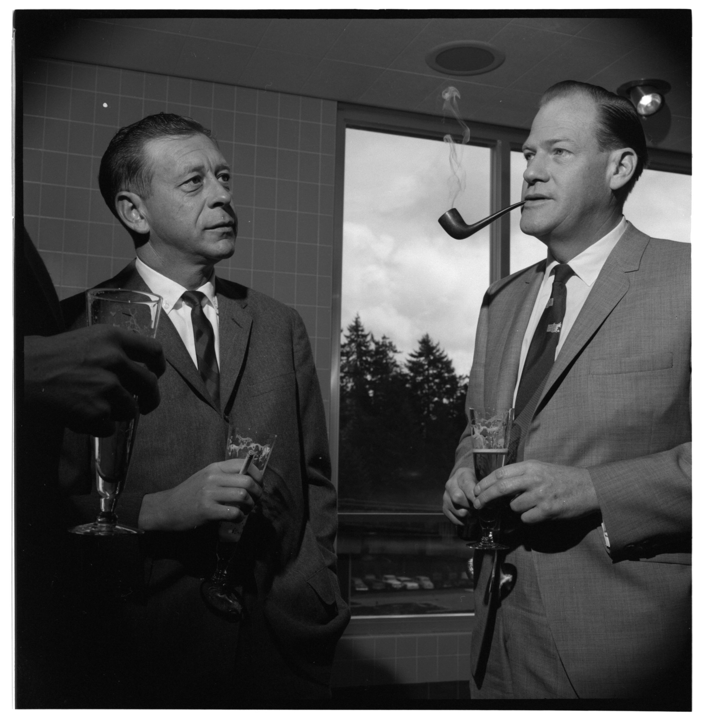 Negative, sheet film. 2 x 2 b&w. No. 884. OB Corp TV. Hank Weaver, radio sports personality from California, visits Olympia brewery and KGY. Article in May 1962 "Its the Water News." At left is Barney Renderer of OBC.Name/Title