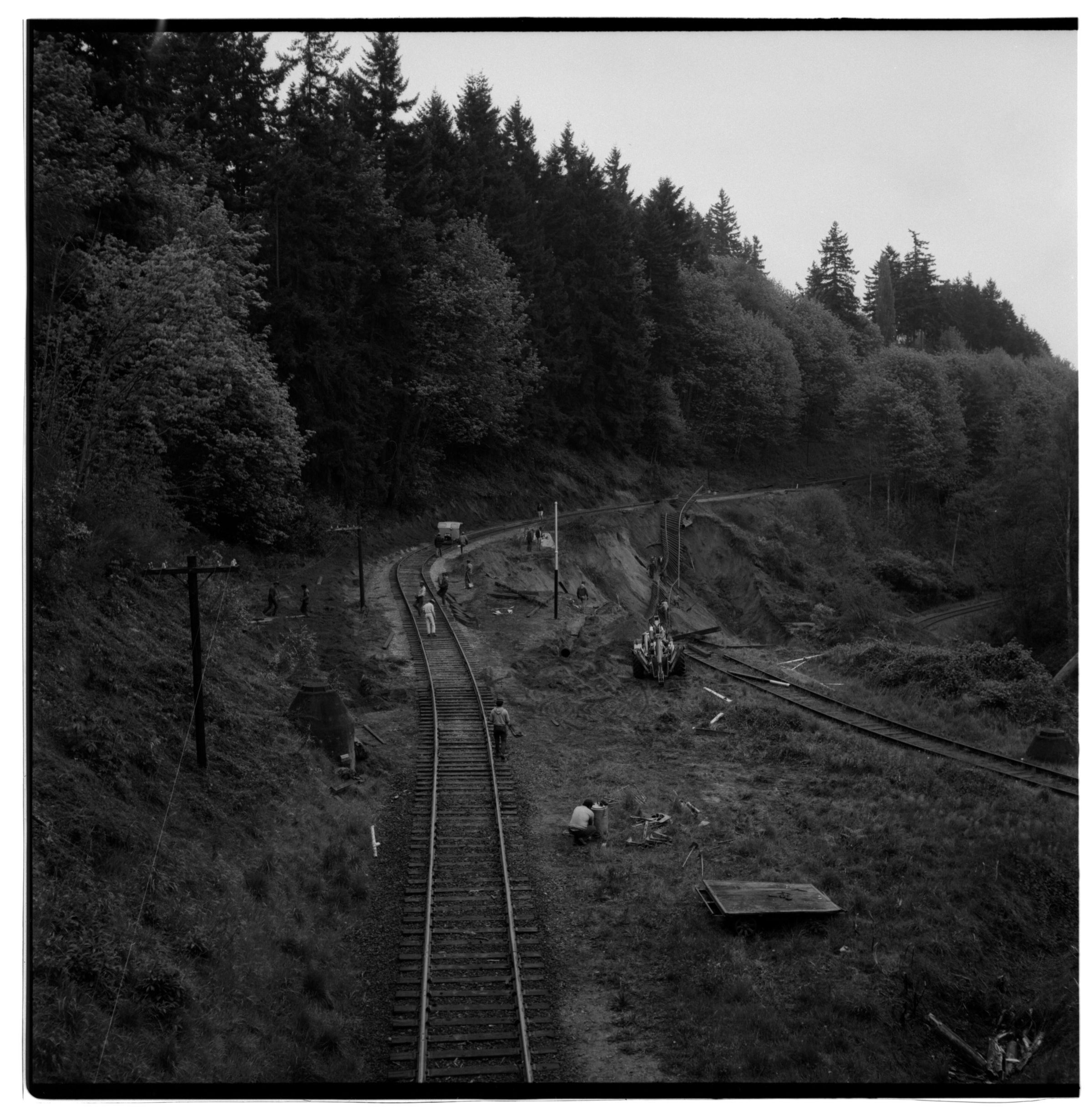 Negative, sheet film. 2 x 2 b&w. Earthquake damage along railroad track after 1965 quake.