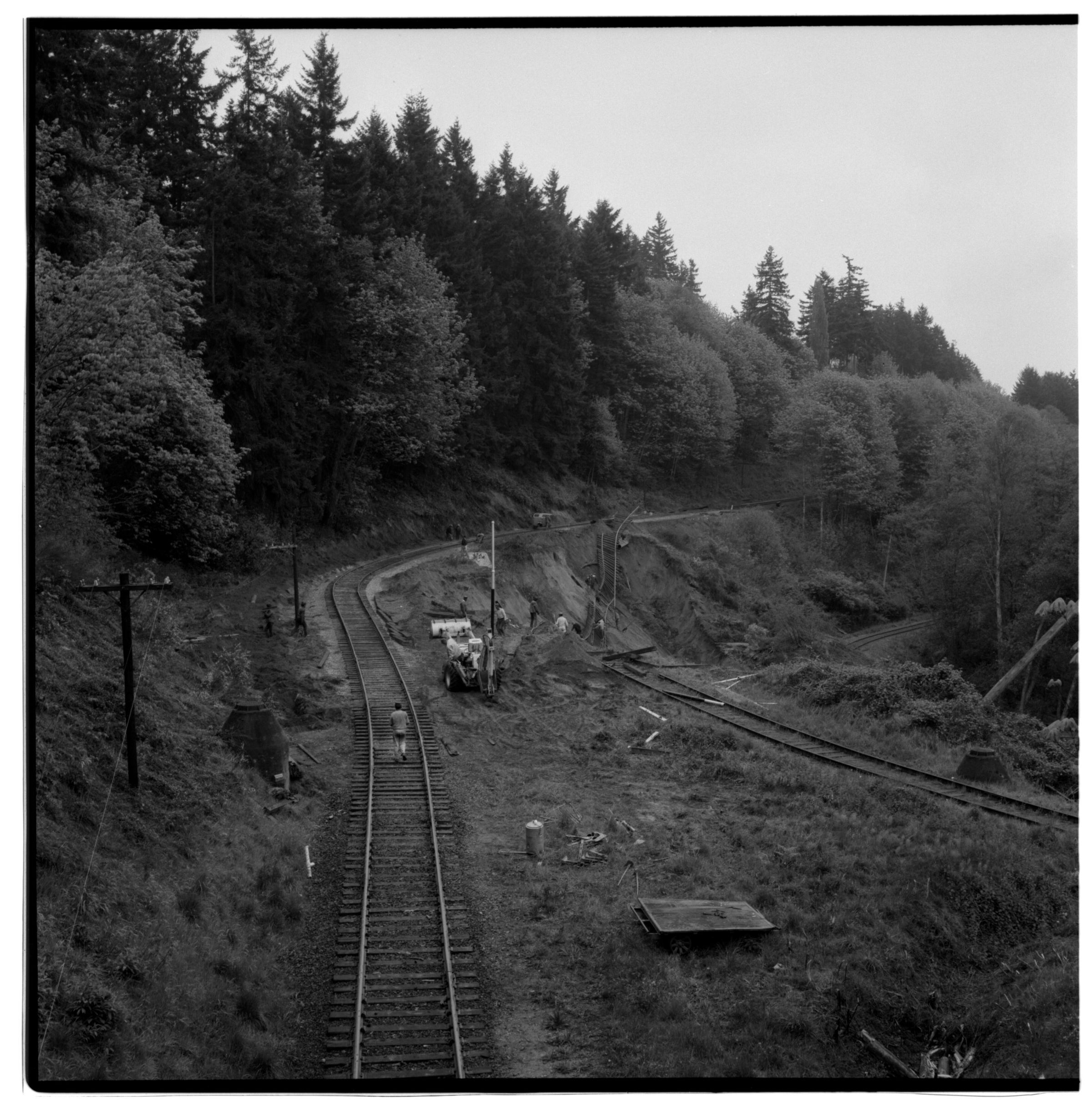 Negative, sheet film. 2 x 2 b&w. Earthquake damage along railroad track after 1965 quake.