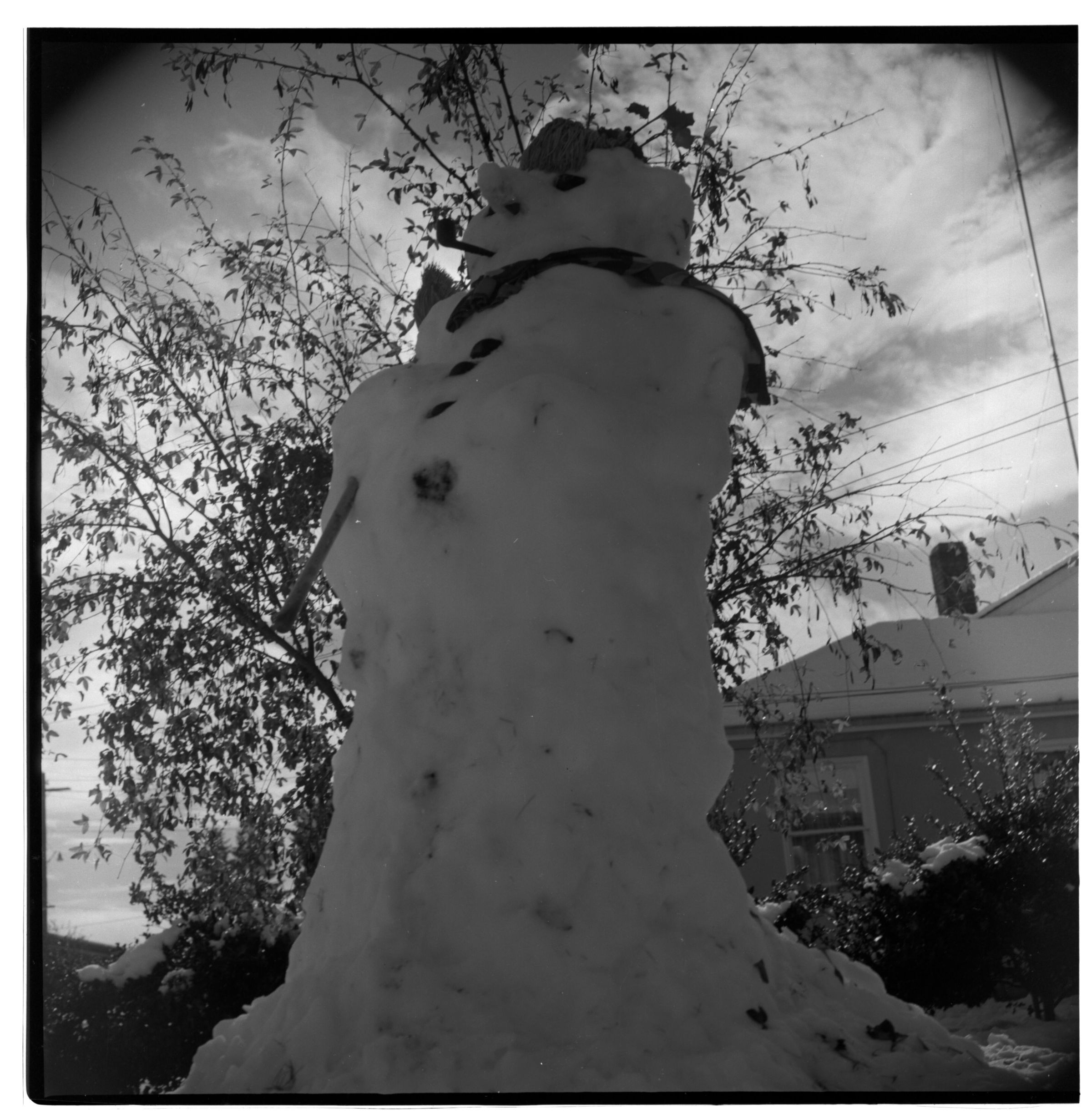 Negative, sheet film. 2 x 2 b&w. No. 781. OB Corp TV. Snowman at unknown location.
