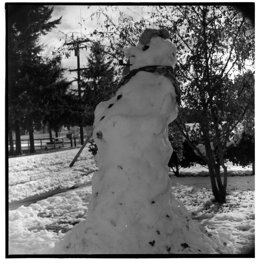 Negative, sheet film. 2 x 2 b&w. No. 781. OB Corp TV. Snowman at unknown location.