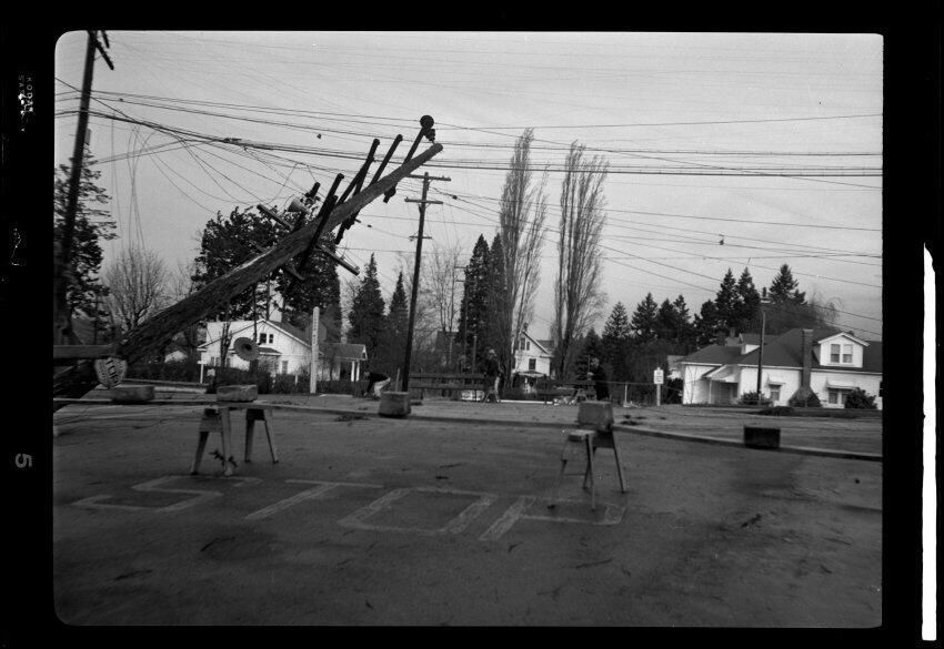 Negative, sheet film. 2.5 x 3.6 b&w. Wind storm damage on Custer Way, at Olympia brewery. Downed utility pole.