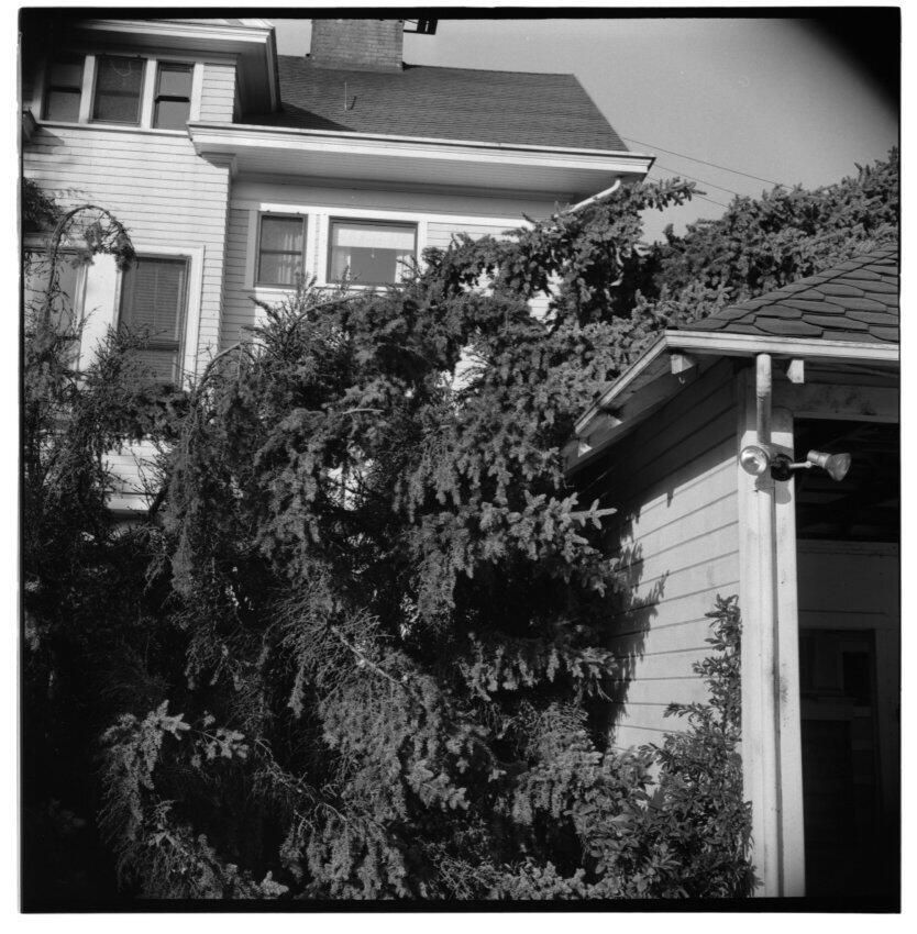 Negative, sheet film. 2 x 2 b&w. No. 916. OB Corp TV. Columbus Day Storm, 1962. Wind storm damage. Tree toppled on Schmidt House garage.