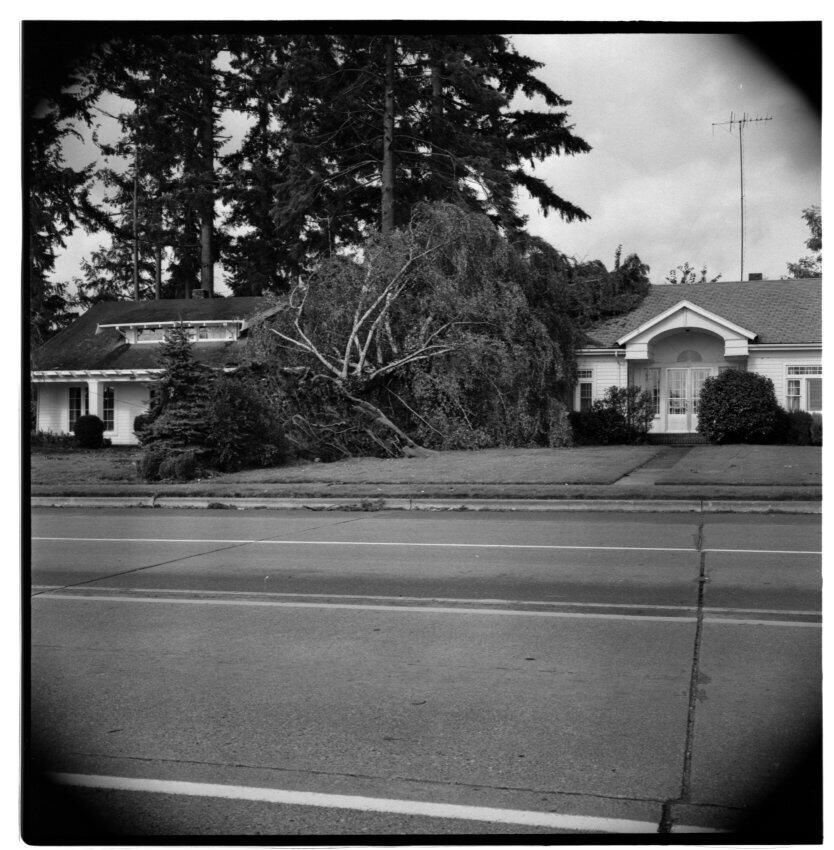 Negative, sheet film. 2 x 2 b&w. No. 916. OB Corp TV. Columbus Day Storm, 1962. Wind storm damage. Trees toppled at homes along Capitol Blvd in Tumwater.
