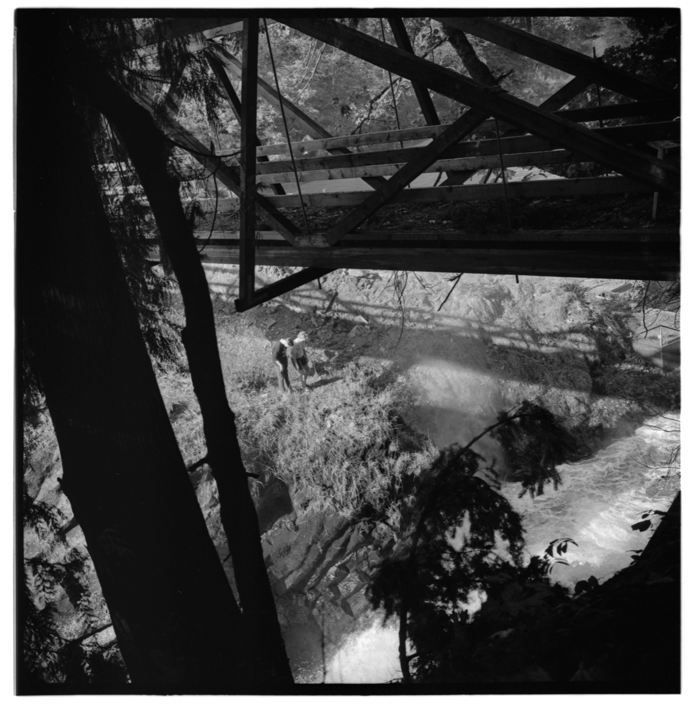 Negative, sheet film. 2 x 2 b&w. No. 916. OB Corp TV. Columbus Day Storm, 1962. Wind storm damage. Unidentified people looking at lower falls of Deschutes River.
