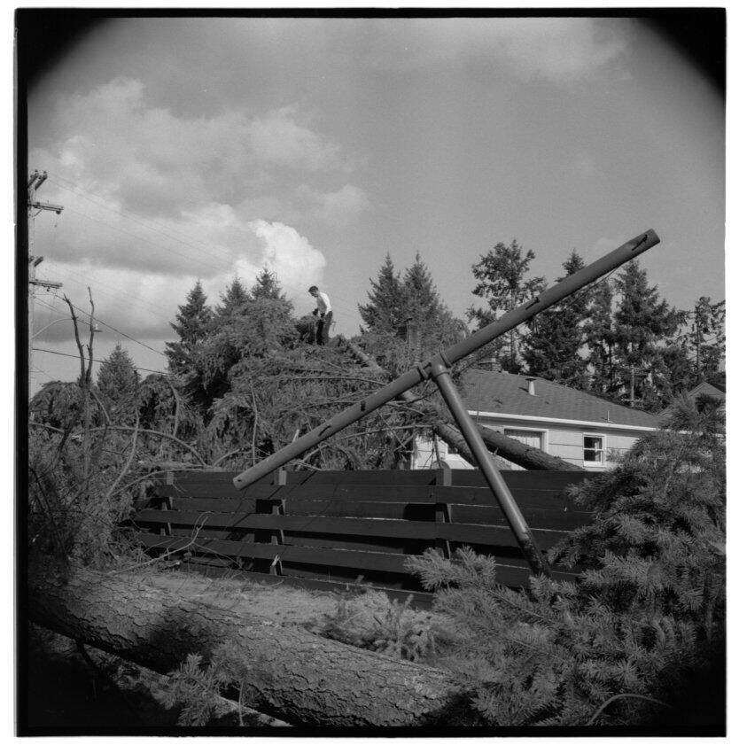 Negative, sheet film. 2 x 2 b&w. No. 916. OB Corp TV. Columbus Day Storm, 1962. Wind storm damage. Trees toppled at unidentified property, probably in Tumwater.
