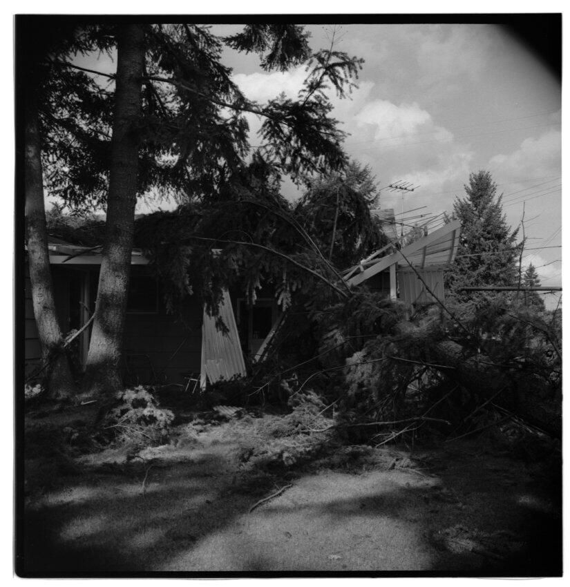 Negative, sheet film. 2 x 2 b&w. No. 916. OB Corp TV. Columbus Day Storm, 1962. Wind storm damage. Tree toppled on Bill Kilde home, Tumwater.