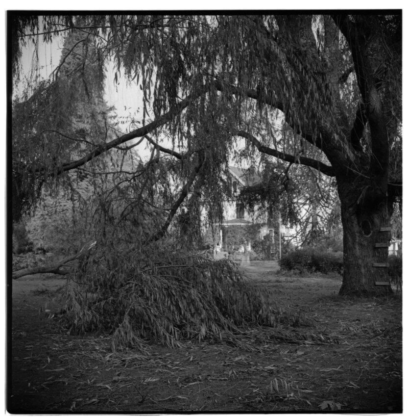 Negative, sheet film. 2 x 2 b&w. No. 916. OB Corp TV. Columbus Day Storm, 1962. Wind storm damage. Broken willow tree at Schmidt House. Monkey puzzle tree visible in right background.