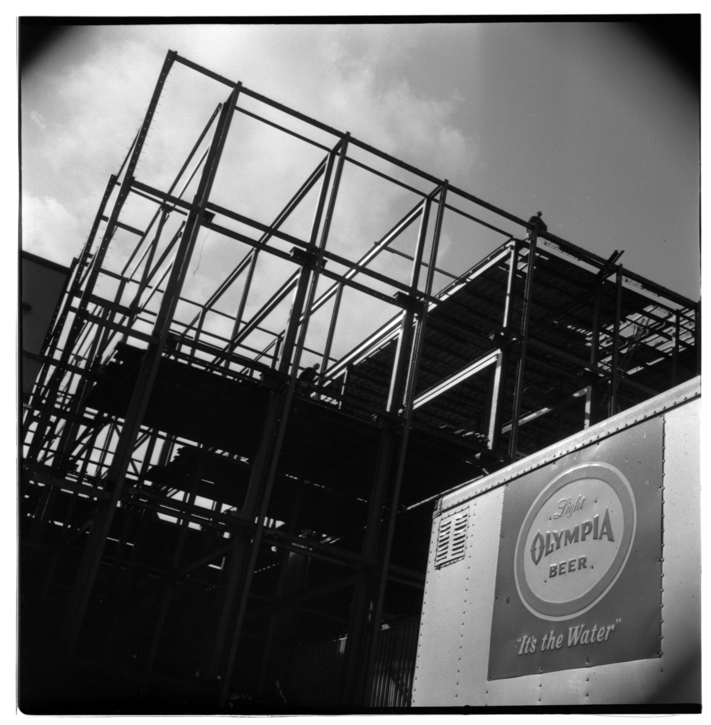 Negative, sheet film. 2 x 2 b&w. No. 916. OB Corp TV. Columbus Day Storm, 1962. Wind storm damage. Checking building under construction at Olympia brewery.