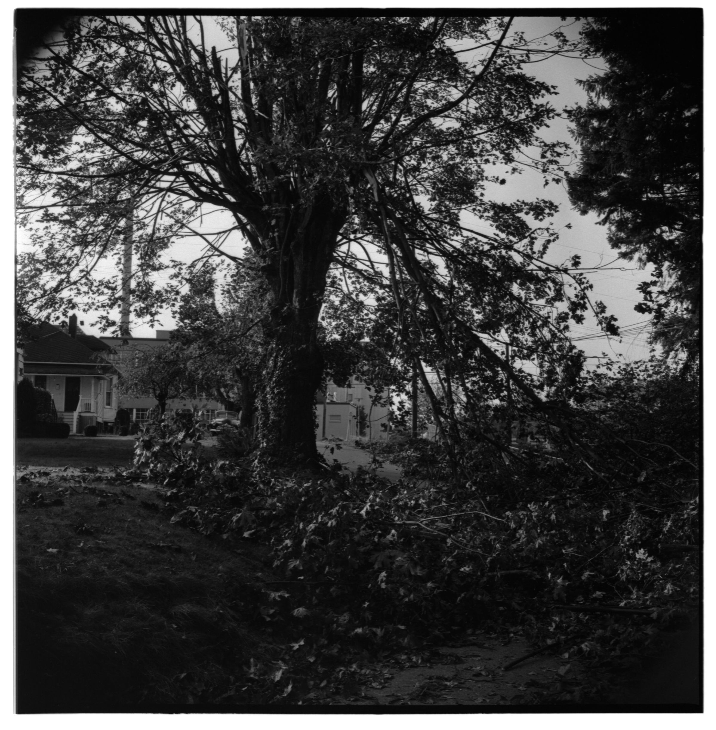 Negative, sheet film. 2 x 2 b&w. No. 916. OB Corp TV. Columbus Day Storm, 1962. Wind storm damage. Broken tree at unknown location, probably in Tumwater.