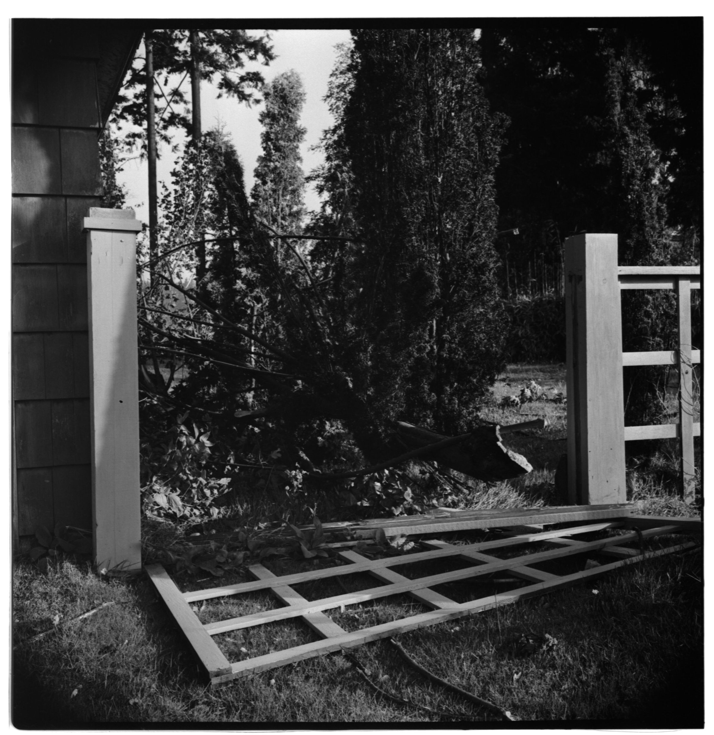 Negative, sheet film. 2 x 2 b&w. No. 916. OB Corp TV. Columbus Day Storm, 1962. Wind storm damage. Fence broken near base of Custer Way bridge.