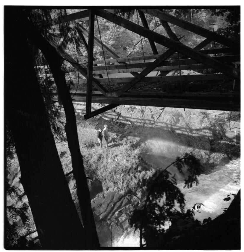Negative, sheet film. 2 x 2 b&w. No. 916. OB Corp TV. Columbus Day Storm, 1962. Wind storm damage. Unidentified people lookinig at lower falls of Deschutes River.