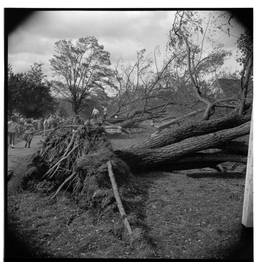 Negative, sheet film. 2 x 2 b&w. No. 916. OB Corp TV. Columbus Day Storm, 1962. Wind storm damage. Toppled trees in Tumwater or Olympia. No ID on people.
