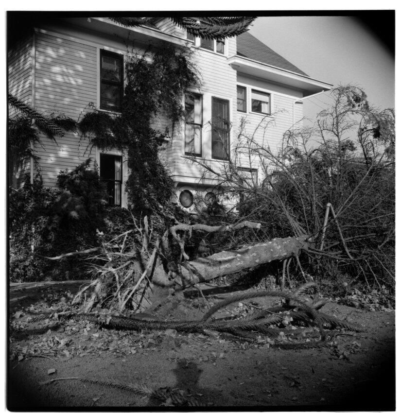 Negative, sheet film. 2 x 2 b&w. No. 916. OB Corp TV. Columbus Day Storm, 1962. Wind storm damage. Fallen tree at Schmidt House. Monkey puzzle tree branch barely visible at top of photo.