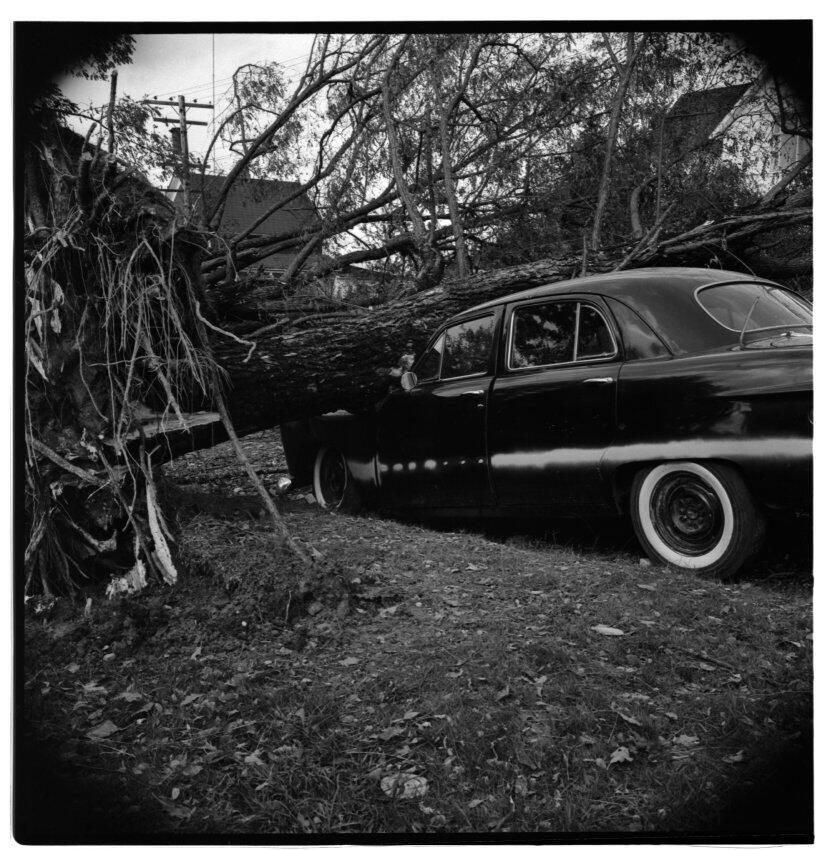 Negative, sheet film. 2 x 2 b&w. No. 916. OB Corp TV. Columbus Day Storm, 1962. Wind storm damage. Fallen tree on car.