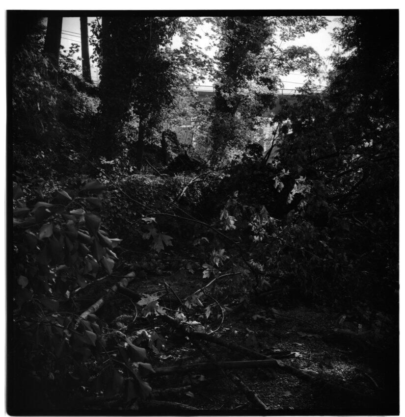 Negative, sheet film. 2 x 2 b&w. No. 916. OB Corp TV. Columbus Day Storm, 1962. Wind storm damage in Tumwater Falls Park.