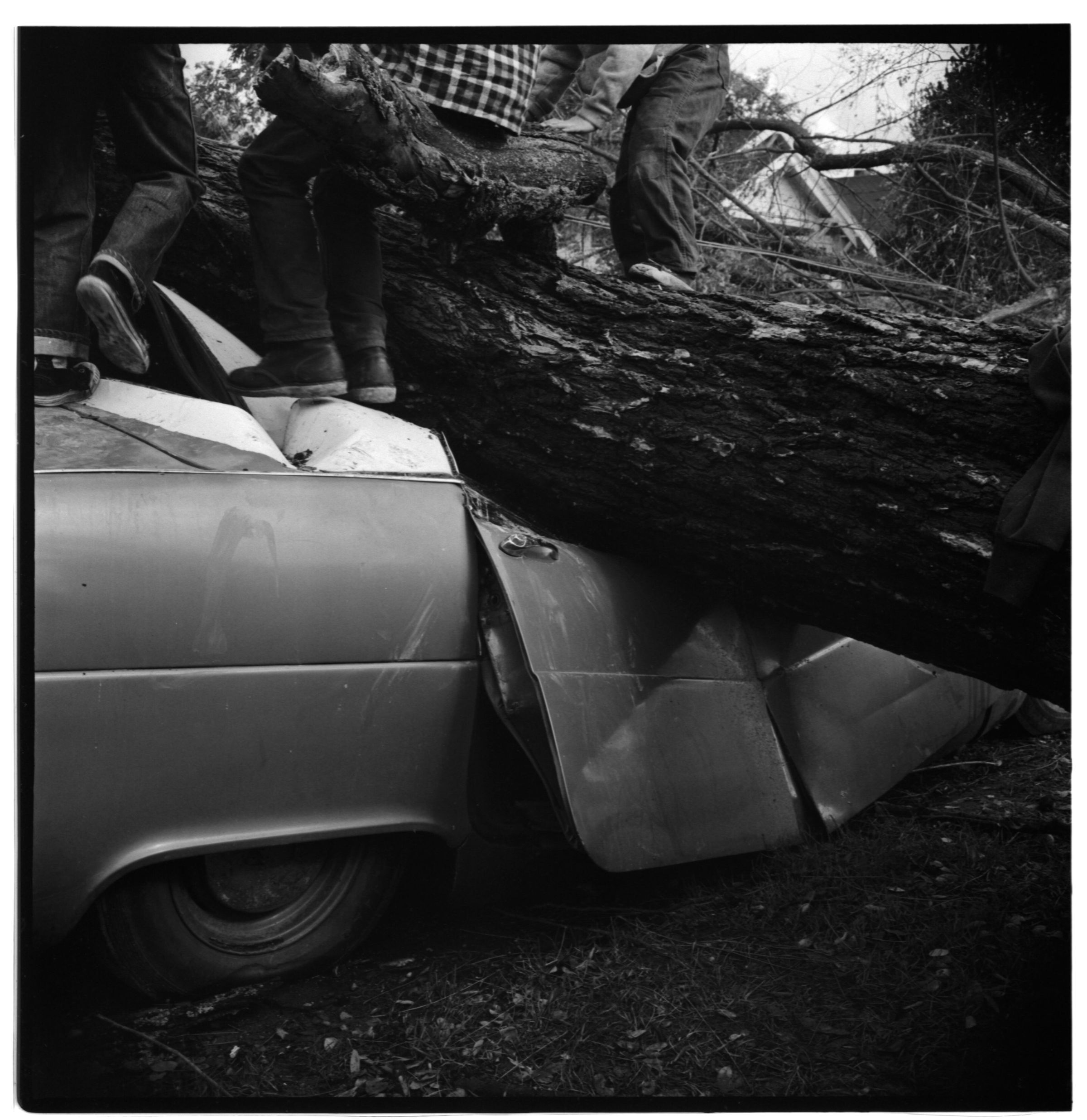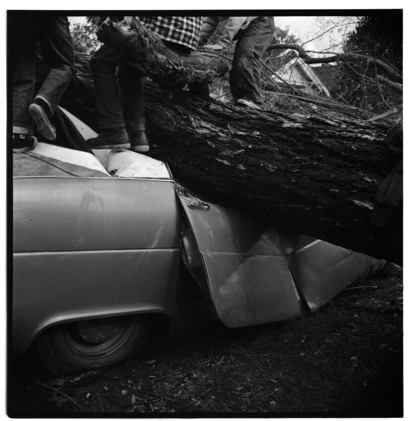 Negative, sheet film. 2 x 2 b&w. No. 916. OB Corp TV. Columbus Day Storm, 1962. Wind storm damage. Tree fallen on car.