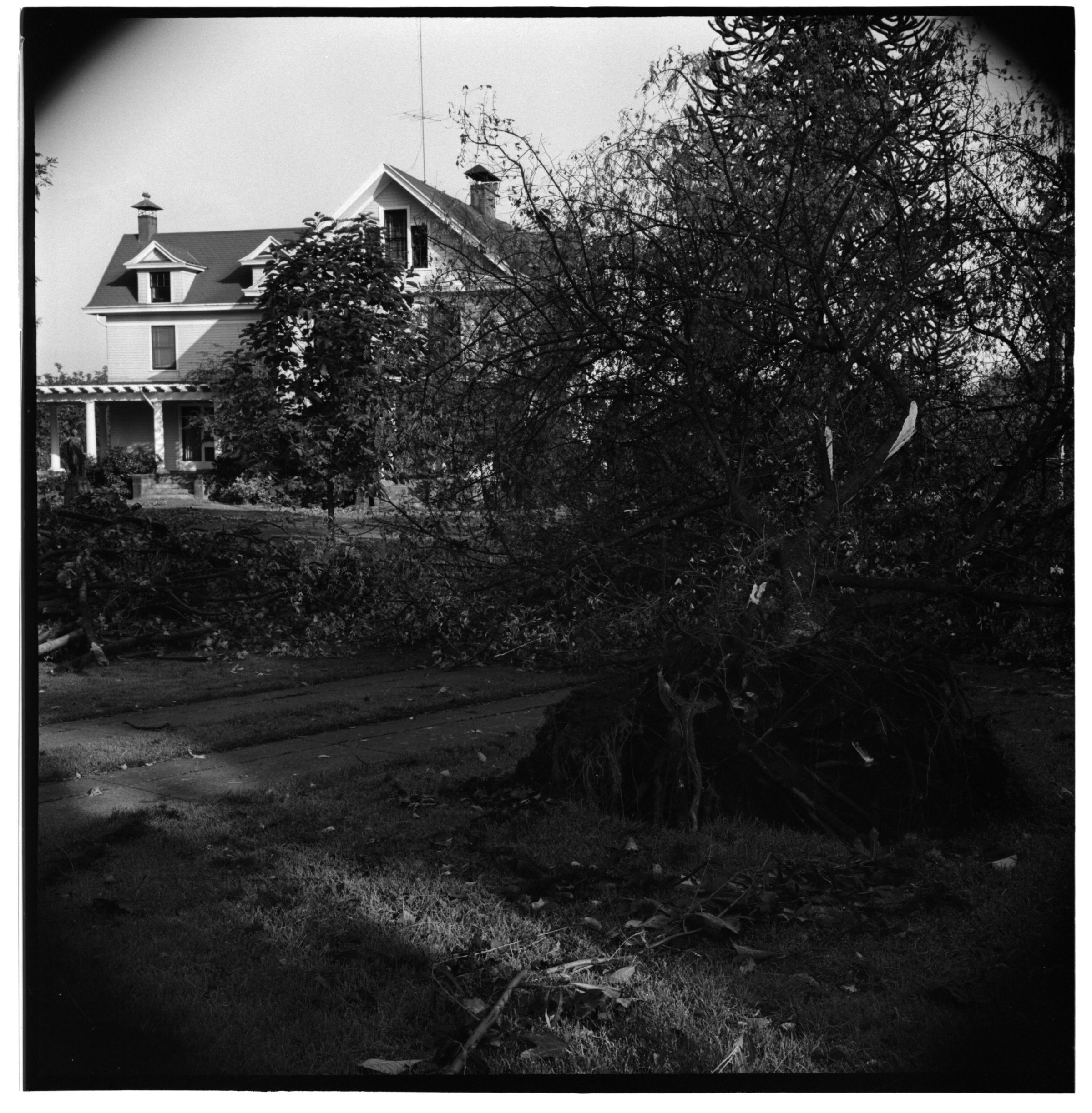 Negative, sheet film. 2 x 2 b&w. No. 916. OB Corp TV. Columbus Day Storm, 1962. Wind storm damage at Schmidt House.