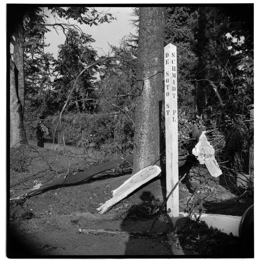Negative, sheet film. 2 x 2 b&w. No. 916. OB Corp TV. Columbus Day Storm, 1962. Wind storm damage at Schmidt House.