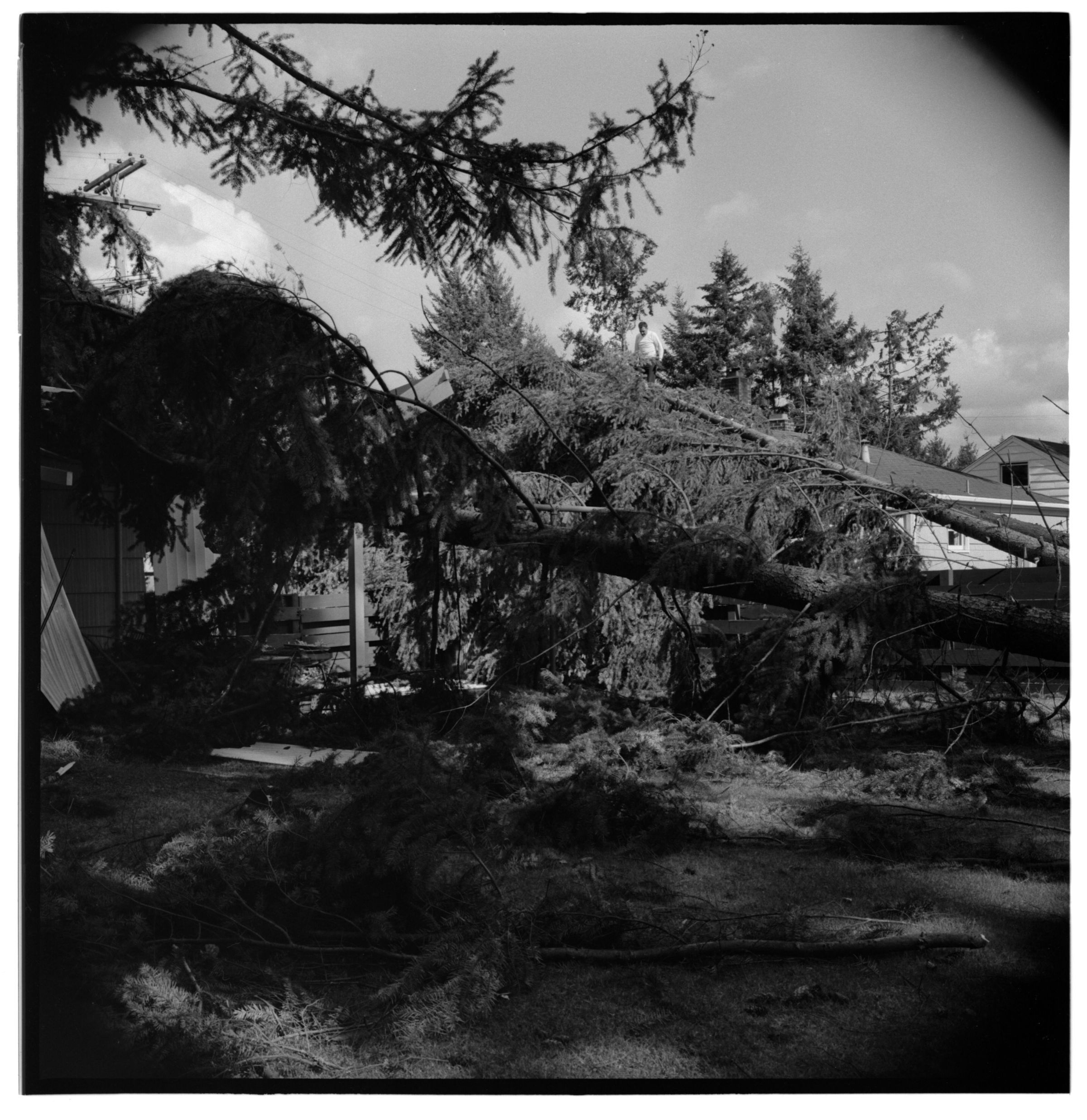 Negative, sheet film. 2 x 2 b&w. No. 916. OB Corp TV. Columbus Day Storm, 1962. Wind storm damage to unidentified home.