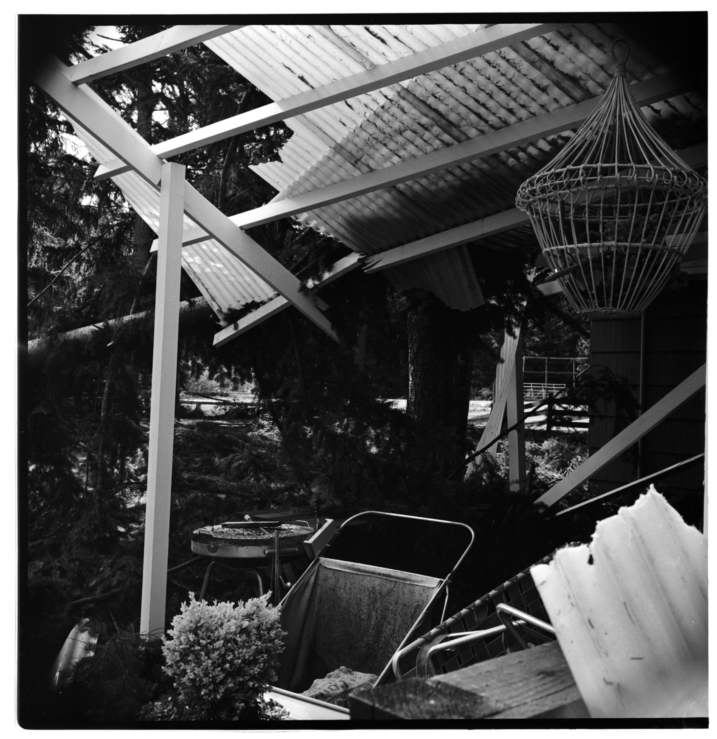 Negative, sheet film. 2 x 2 b&w. No. 916. OB Corp TV. Columbus Day Storm, 1962. Wind storm damage to unidentified home.