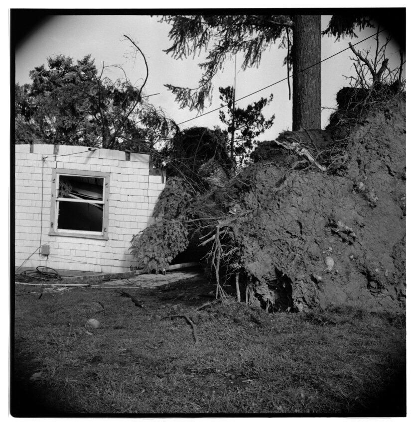 Negative, sheet film. 2 x 2 b&w. No. 916. OB Corp TV. Columbus Day Storm, 1962. Wind storm damage to unidentified home.