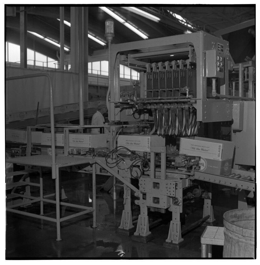 Negative, sheet film. 2 x 2 b&w. Case packer at St. Paul Brewery.