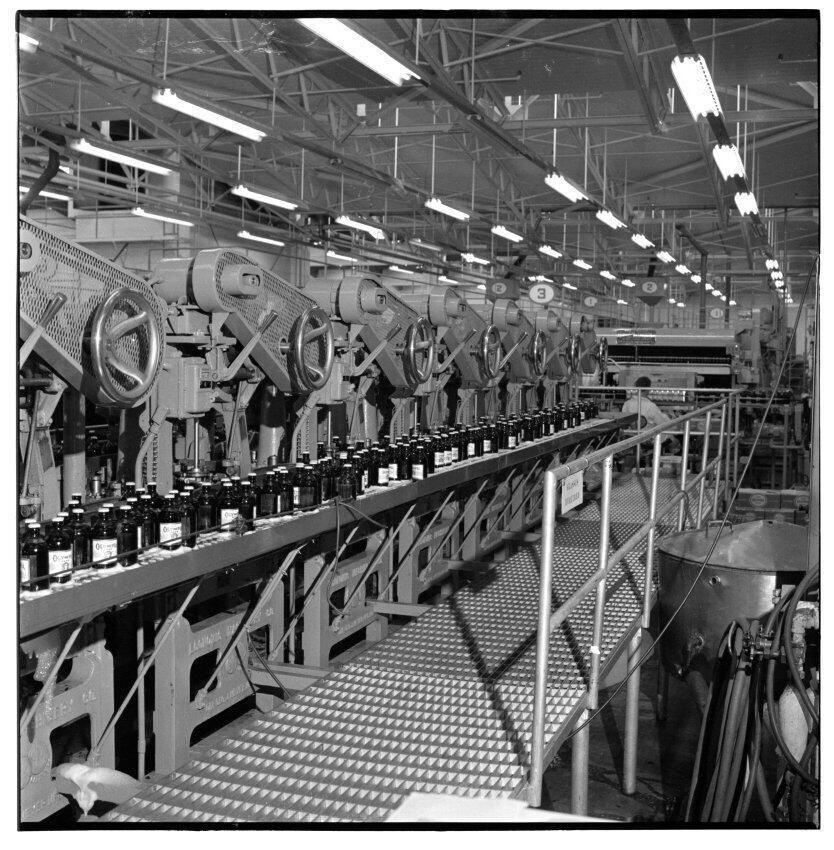 Negative, sheet film. 2 x 2 b&w. Labelers at St. Paul Brewery.