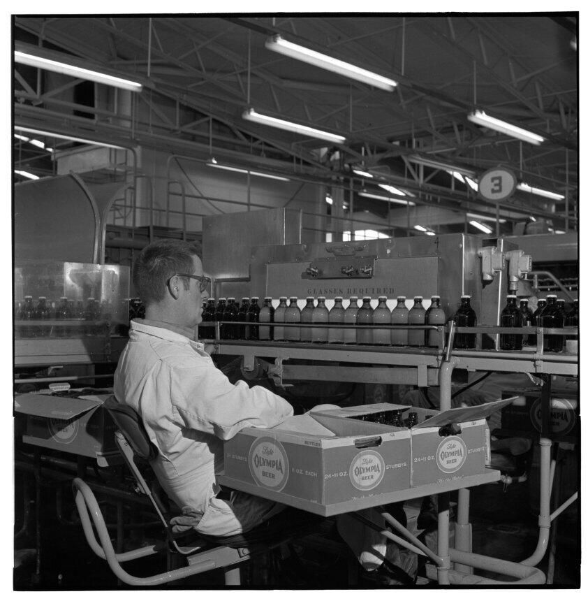 Negative, sheet film. 2 x 2 b&w. Inspecting at St. Paul Brewery.