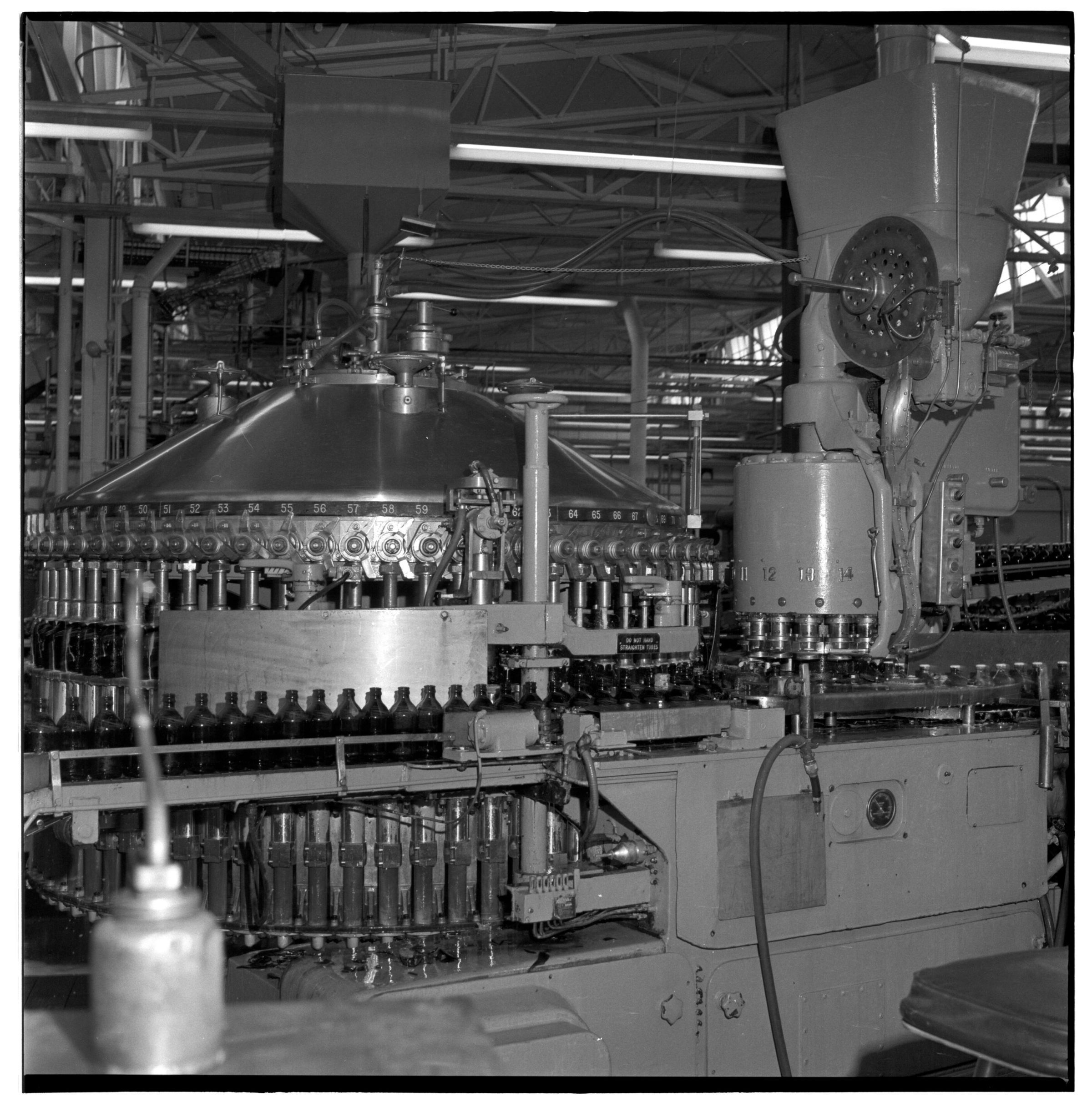 Negative, sheet film. 2 x 2 b&w. Filler at left, capper at right, St. Paul Brewery.