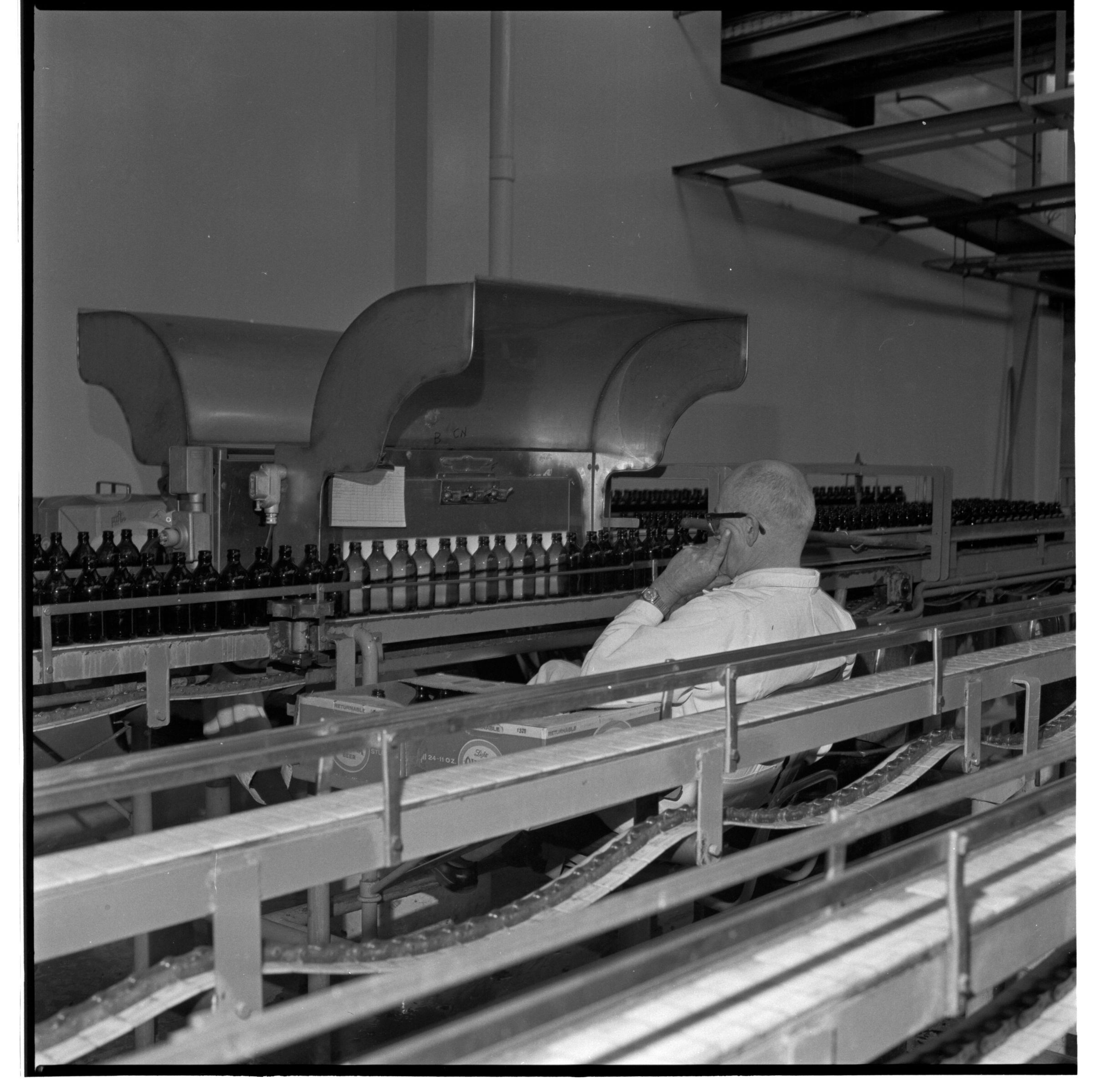 Negative, sheet film. 2 x 2 b&w. Inspecting at St. Paul Brewery.
