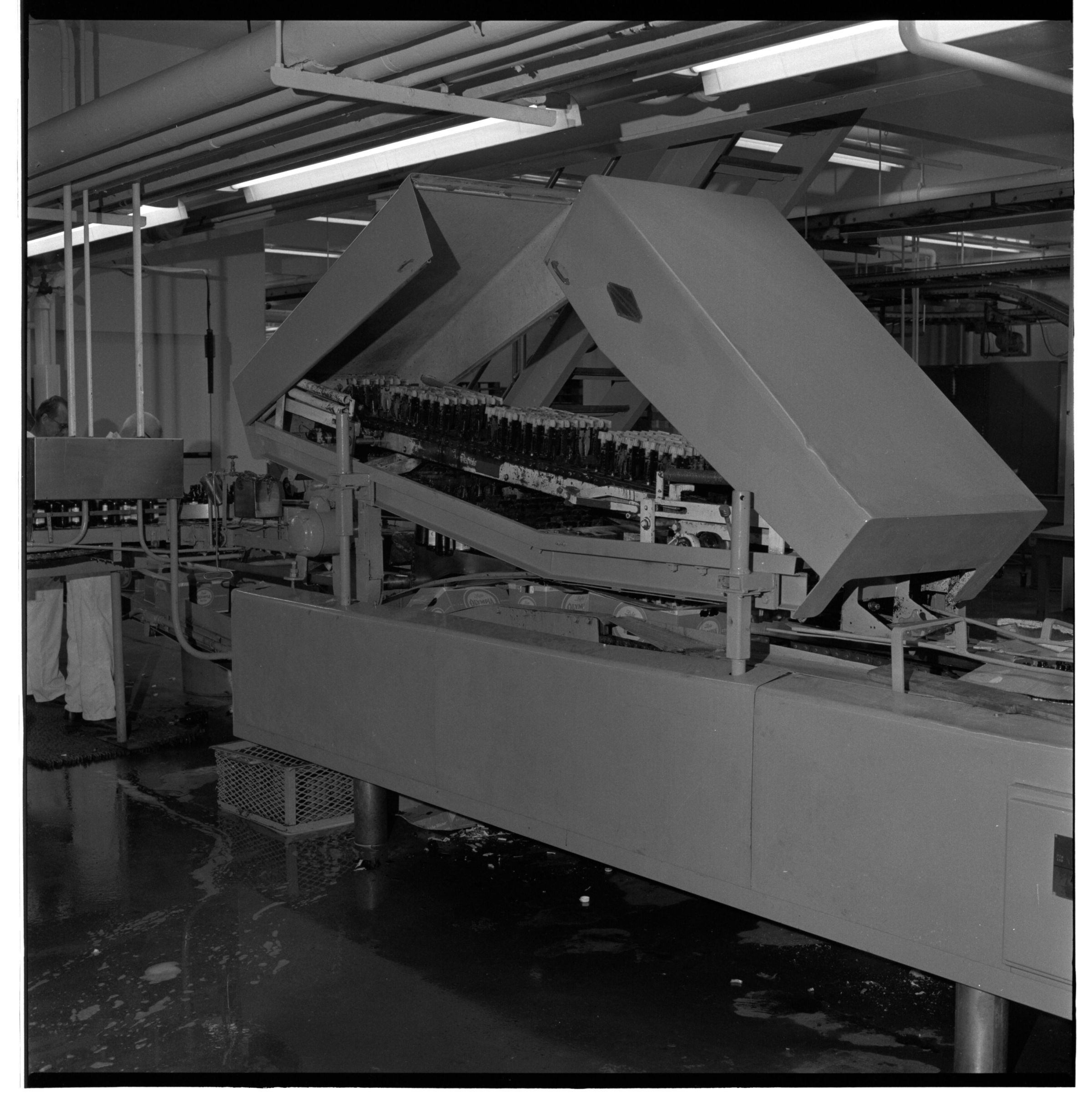 Negative, sheet film. 2 x 2 b&w. Case packer at St. Paul Brewery.