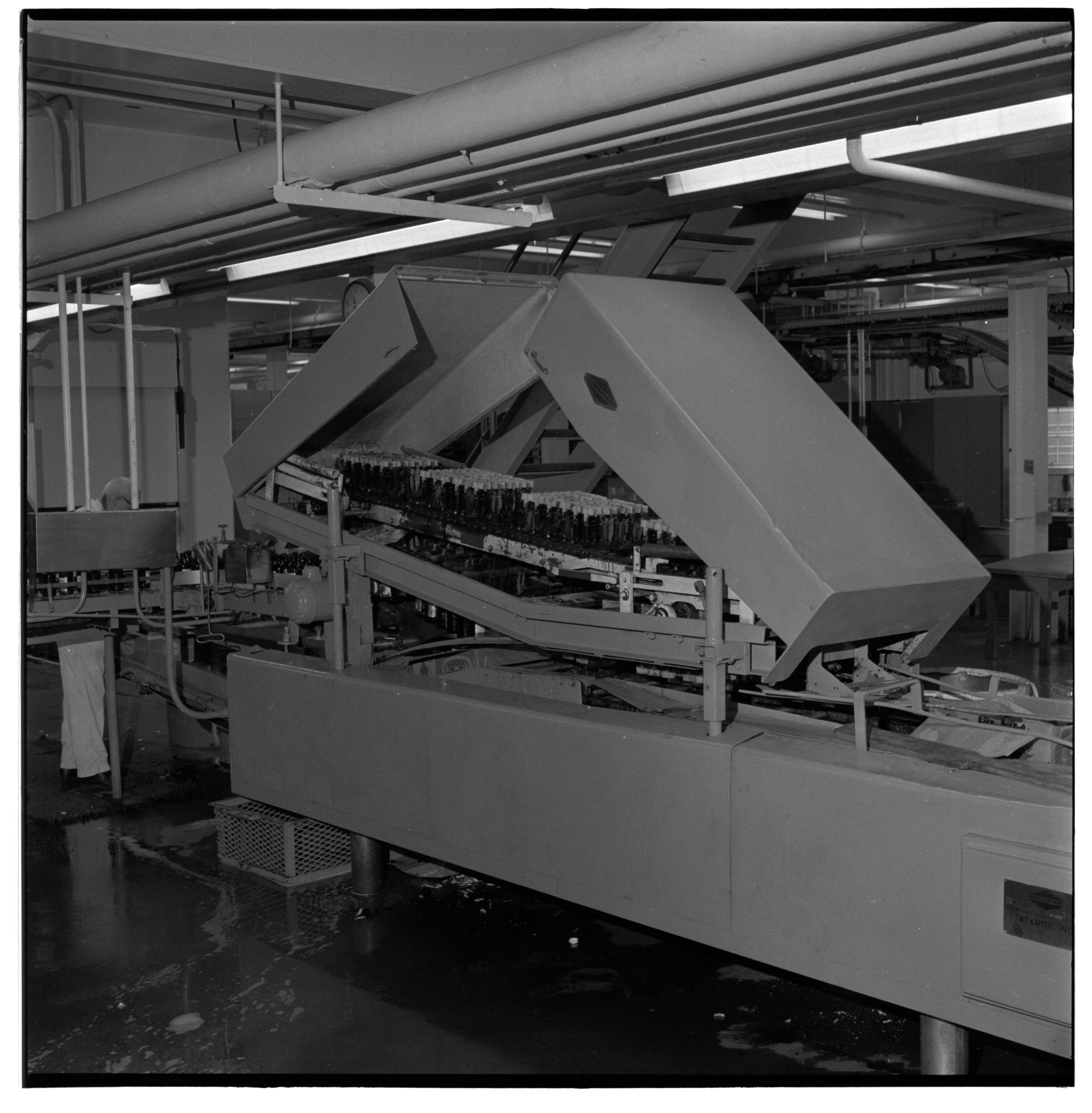 Negative, sheet film. 2 x 2 b&w. Case packer at St. Paul Brewery.