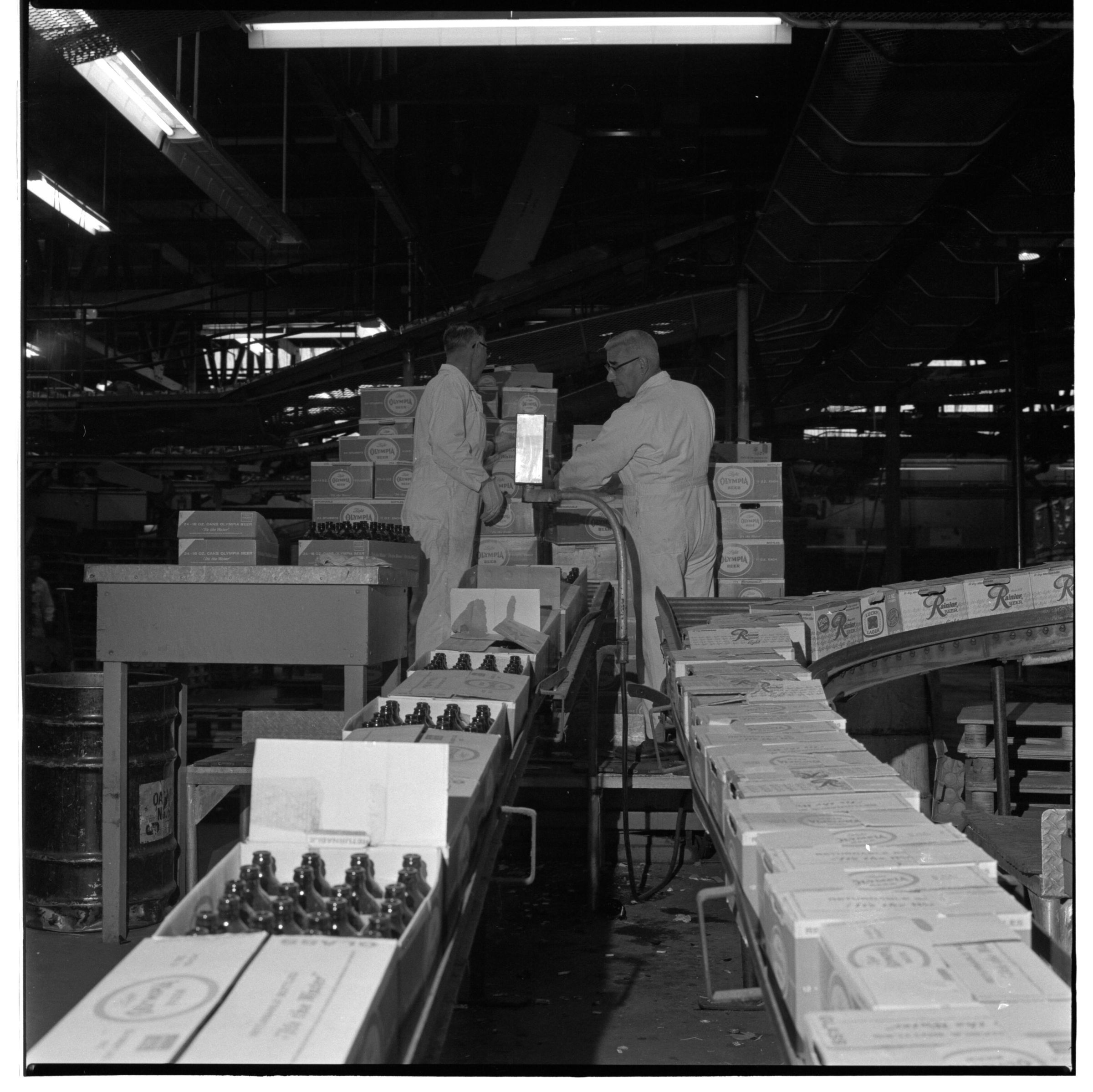 Negative, sheet film. 2 x 2 b&w. Case sealer at St. Paul Brewery.