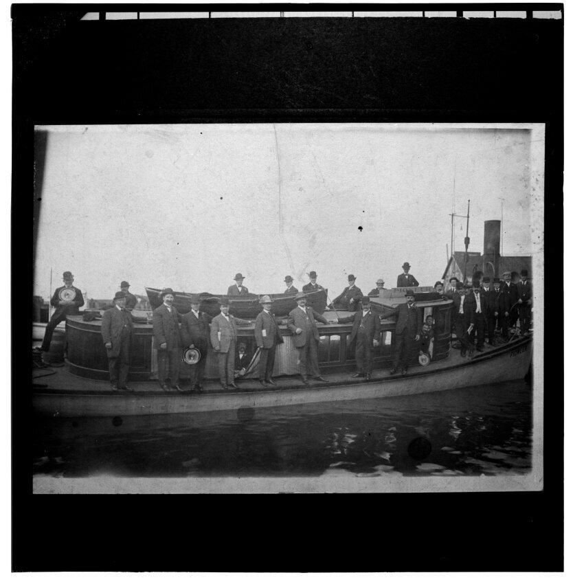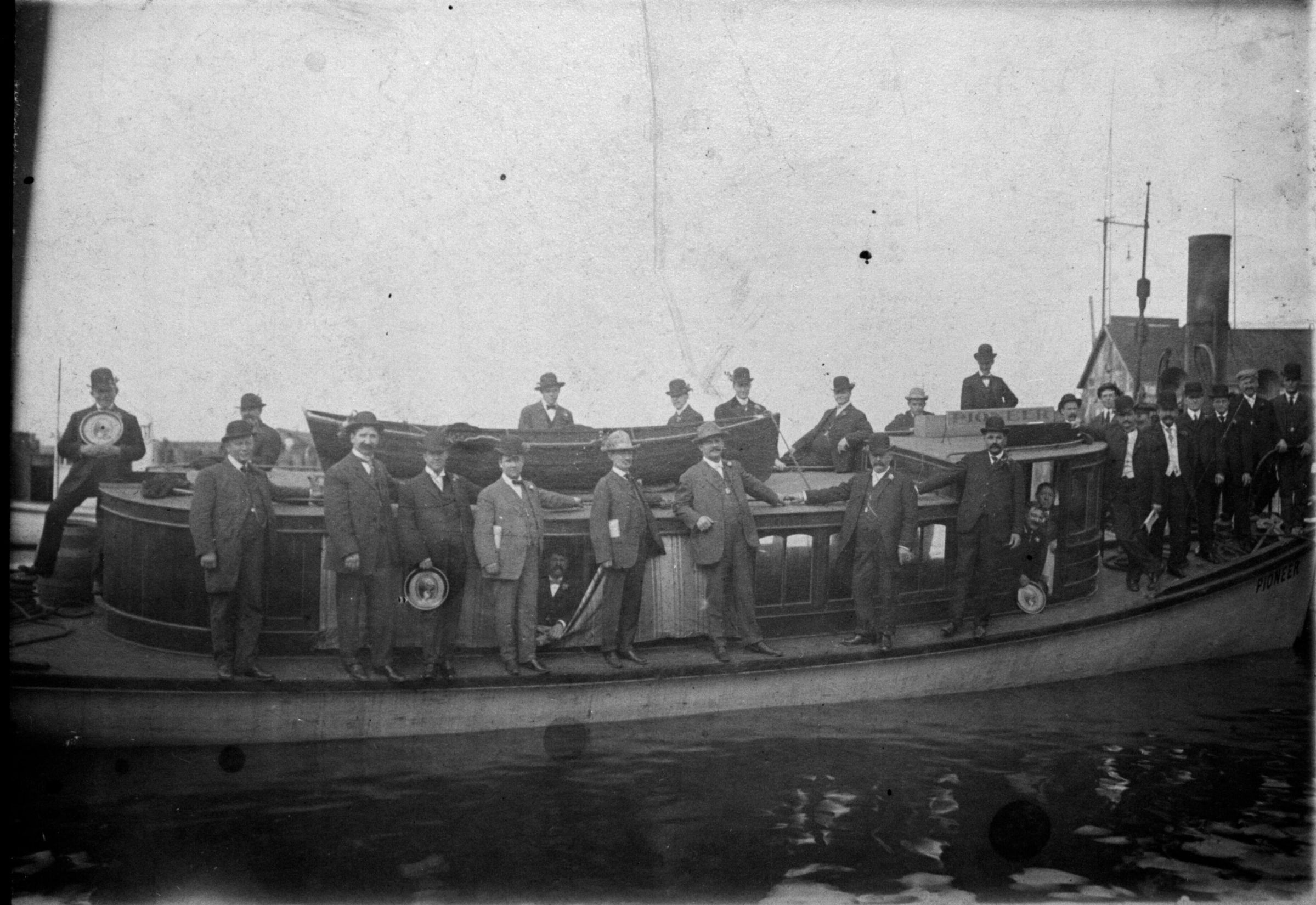 Negative, sheet film. 2 x 2 b&w. Large group of men standing on boat, probably in Olympia WA. Leopold Schmidt brought a group of businessmen and distributors on an excursion from Seattle to Olympia to view the area and the Olympia brewery. Some men are holding Olympia Beer trays.Name/Title
