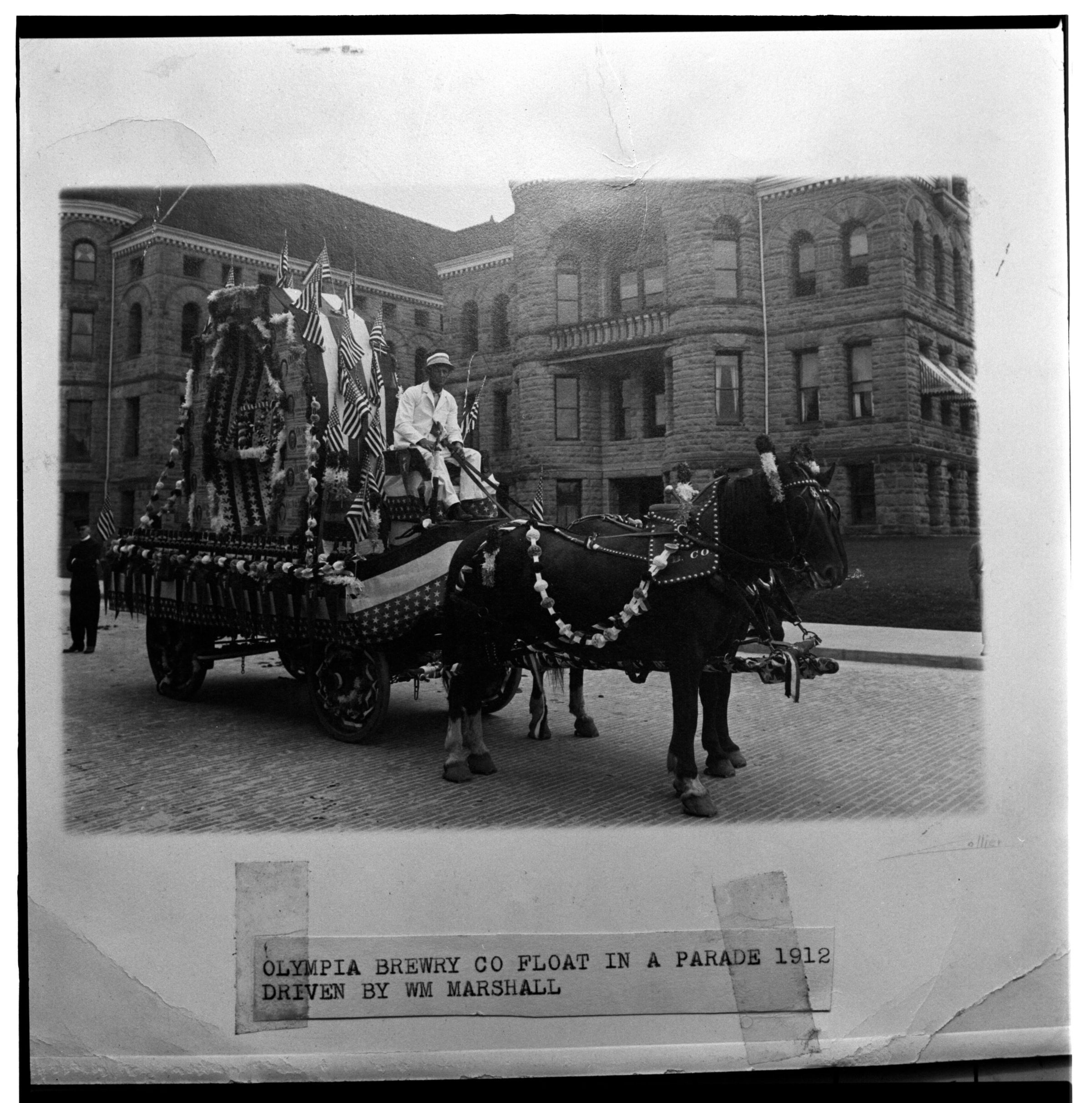 Negative, sheet film. 2 x 2 b&w. Olympia brewery parade entry, 1912, taken in front of old county building (now offices of Superintendent of Public Instruction) in downtown Olympia. Decorated wagon is pulled by two horses, driven by William Marshall.Name/Title
