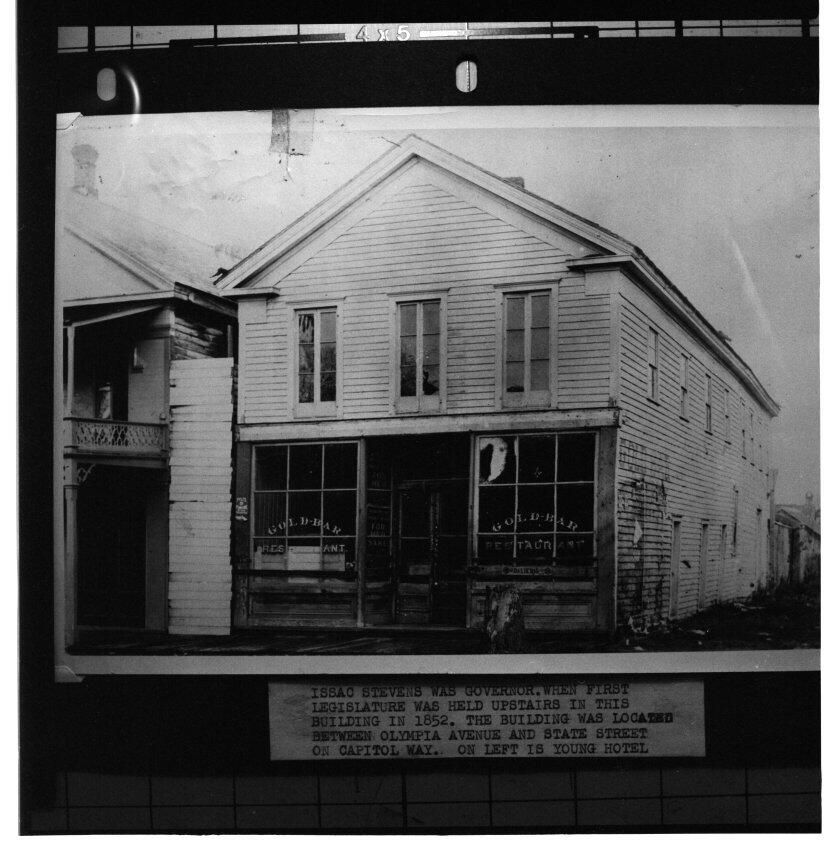 Negative, sheet film. 2 x 2 b&w. Caption reads: "Isaac Stevens was governor when first legislature was held upstairs in this building in 1852. The building was located between Olympia Avenue and State Street on Capitol Way. On left is Young Hotel." Caption is wrong on date; first legislature was held in 1854. The building was then known as the Parker & Colter Building (mercantile and express business run by John G. Parker and Henry Colter). Later, building became the Gold Bar Restaurant.Name/Title