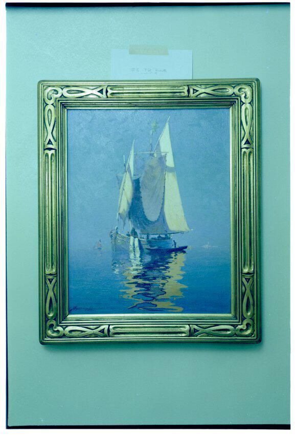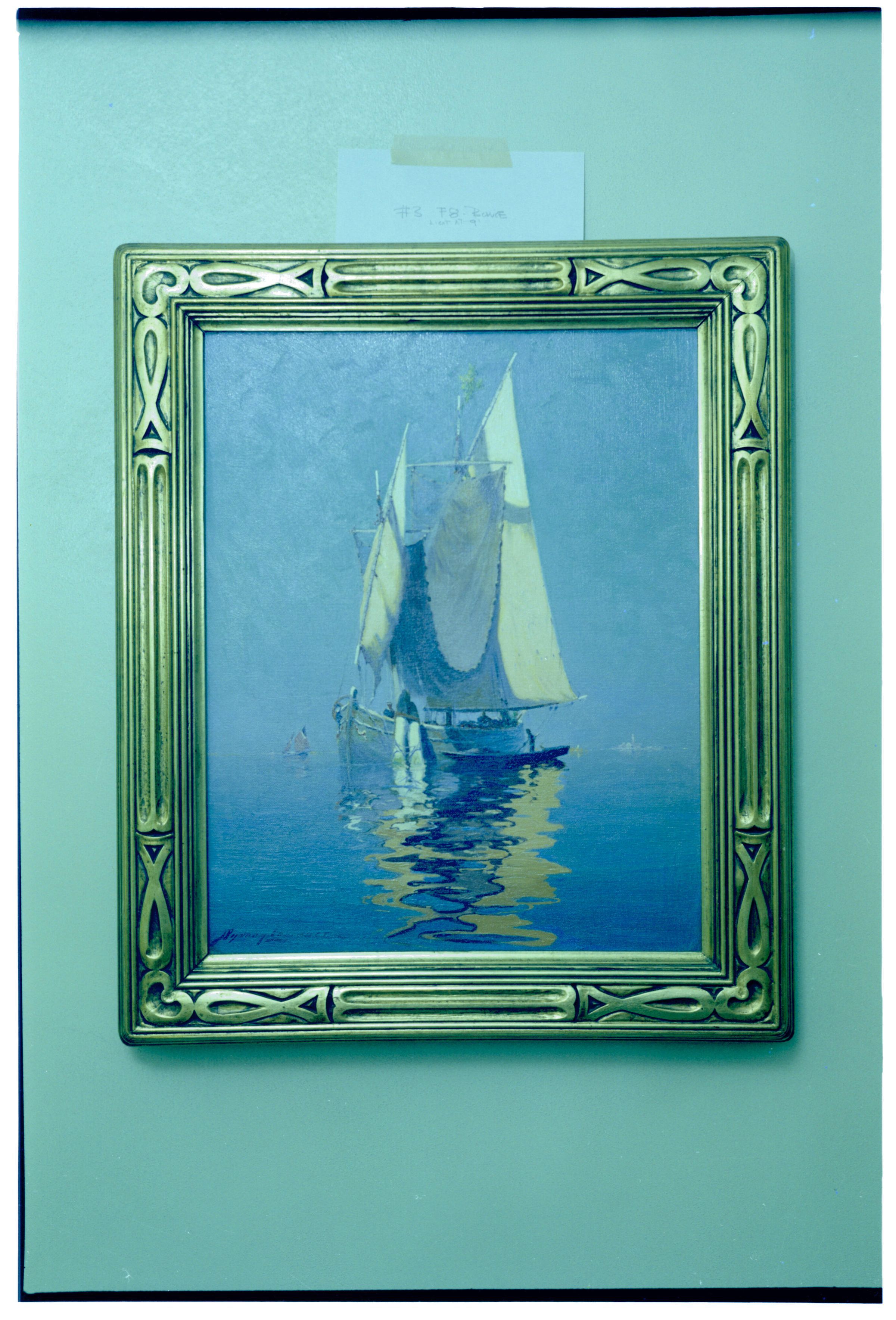 Negative, sheet film. 3 x 2 color. Schmidt family photos. Unidentified painting of sailboats by Sydney Laurence, Alaska artist who became friend of Schmidts.