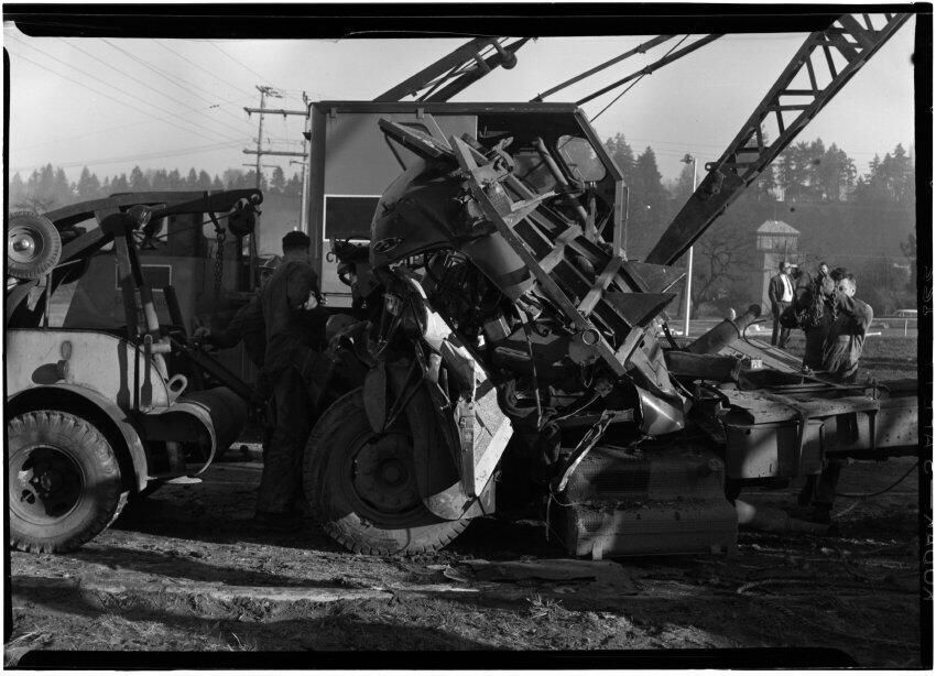 Negative, sheet film. 2 x 3 b&w. Wreck on Interstate 5 just west of Olympia brewery. Driver of logging truck was killed.