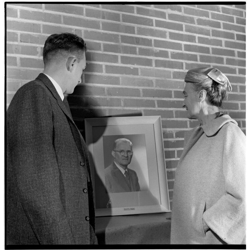 Negative, sheet film. 2 x 2 b&w. Dedication of Peter G. Schmidt Elementary School in Tumwater. Principal Jim Pill and Clara Schmidt (widow of Peter G. Schmidt) with portrait of Peter G.