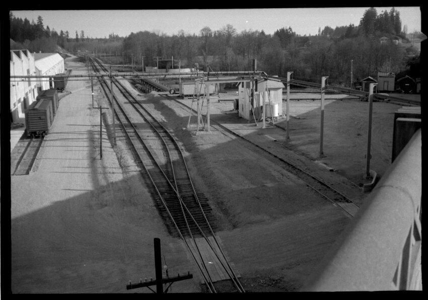 Negative, sheet film. 1 x 1.5 b&w. B bottleshop and warehouse area, railroad sidings, of Olympia brewery. Looking south. Small building near center of photo is the first boiler that was installed in the warehouse area.Name/Title